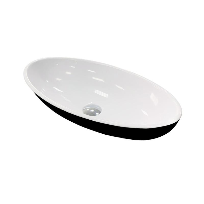 The Adamant ANDERE NEW sink features an oval shape, made of artificial stone with dimensions 590 x 295 x 130 mm and black-white color. Overlay installation type without hole for faucet and overflow allows flexible mounting on countertop or cabinet. The material consists of 80% cast stone and 20% sanitary artificial ceramics, with walls up to 20 mm thick. The surface is smooth, resistant to dyes and chemicals, withstands temperatures up to +165°C.