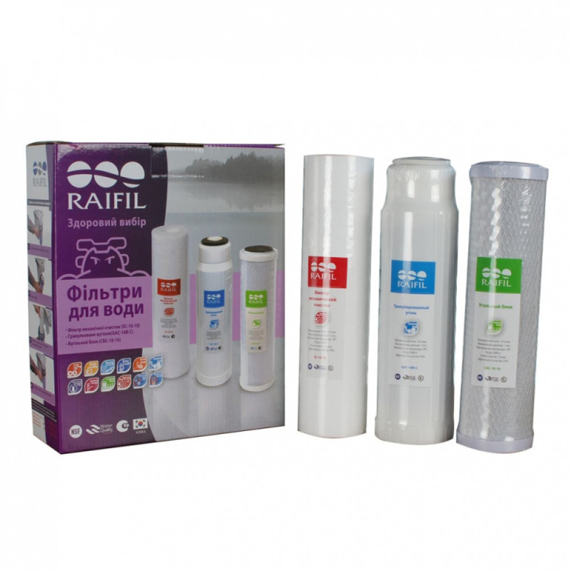 The Raifil 1-2-3 Violet cartridge set is designed for multi-stage purification of cold water in domestic water purification systems. The set combines mechanical filtration and two stages of sorption purification based on activated carbon. This configuration reduces the content of mechanical impurities, chlorine, and organic compounds in the water. The set is used as a preliminary purification stage before the reverse osmosis membrane.