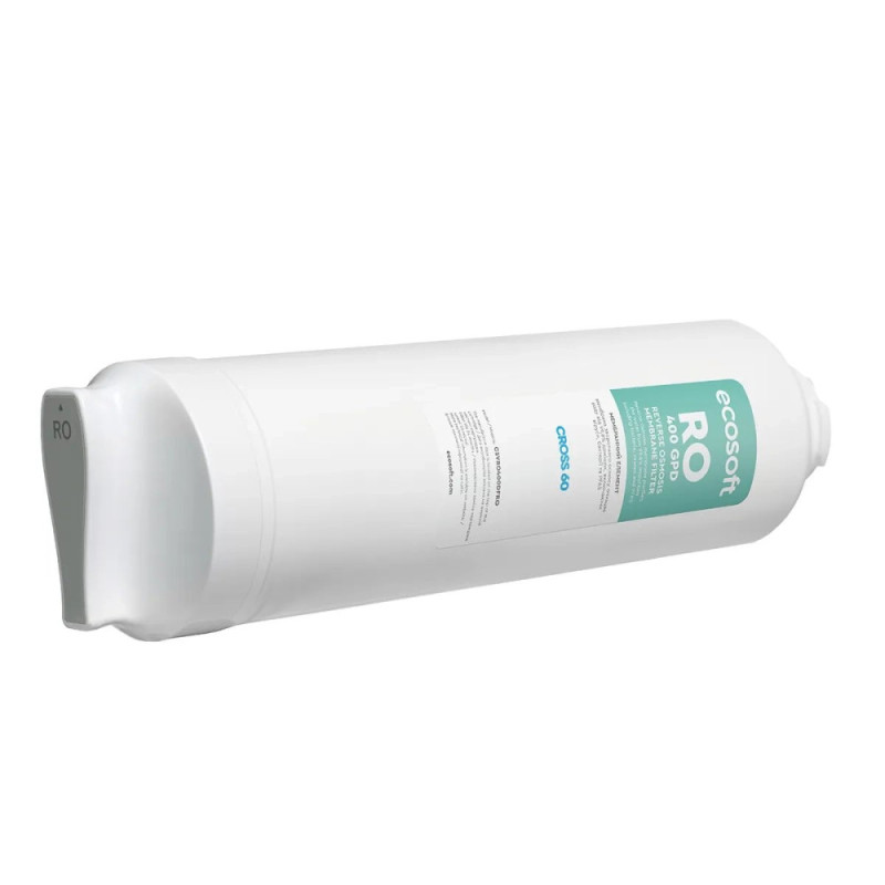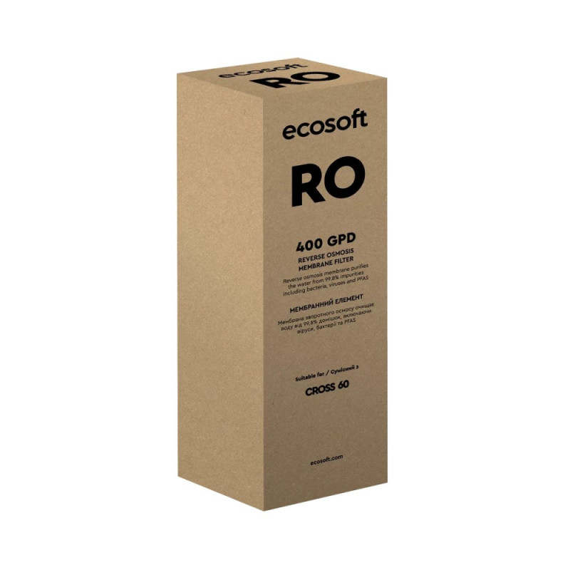 The Ecosoft 400 GPD reverse osmosis membrane is designed for use in the CROSS60 system and provides stable water purification on a daily basis. Its capacity is up to 60 liters of purified water per hour, which meets the needs of domestic use. The membrane element performs deep purification from dissolved impurities, bacteria, and viruses. The design allows for easy and dry replacement without tools. The recommended replacement period is once every 24 months.