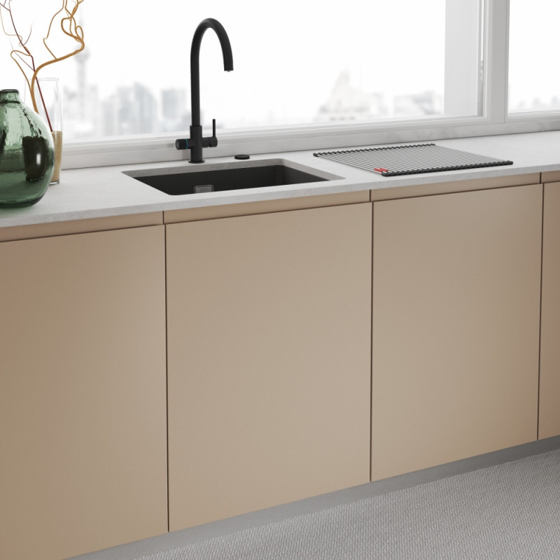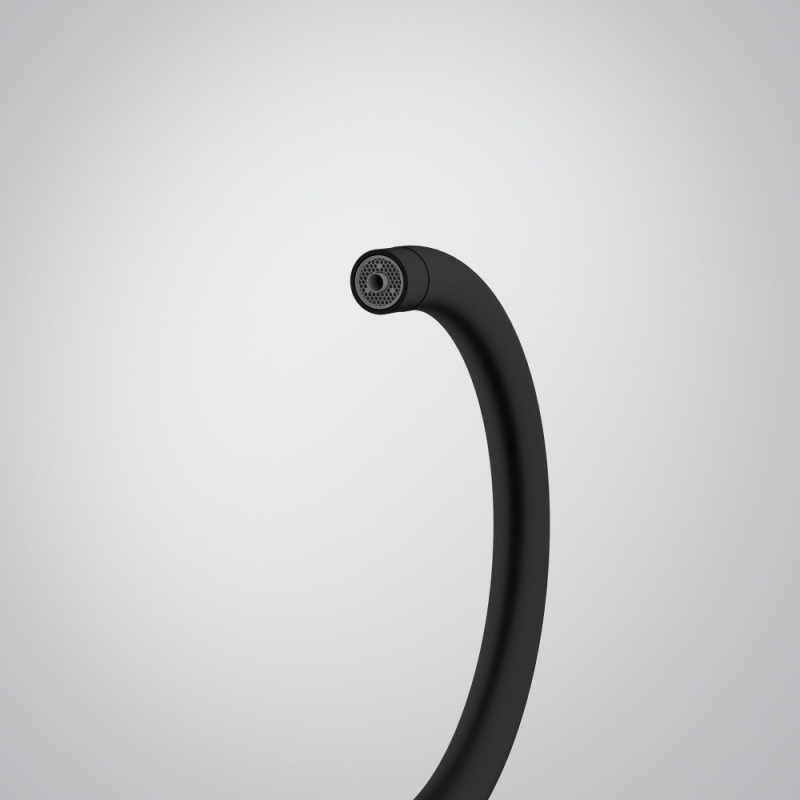 The Franke Lina J Clear Water 2.0 120.0730.807 kitchen faucet supplies both regular and filtered water without the need for an extra tap. Its 360° swivel J-shaped spout offers excellent reach and flexibility for daily tasks. The forward-opening lever enables installation close to a wall or on compact countertops. The matte black finish adds a modern accent to the kitchen. The aerator enriches the stream with air, improving washing efficiency and reducing water consumption.