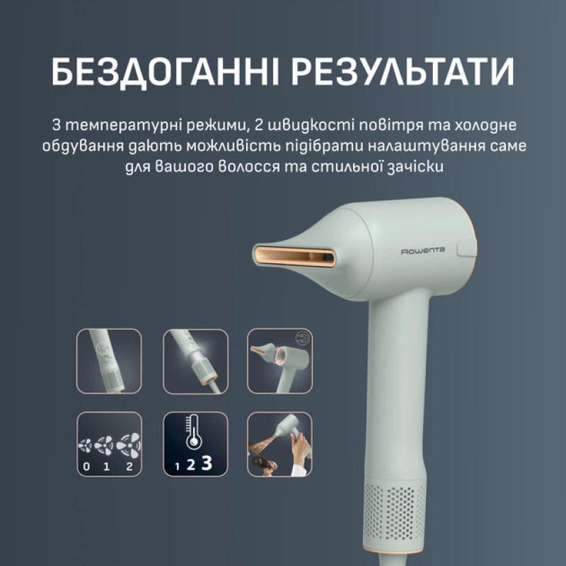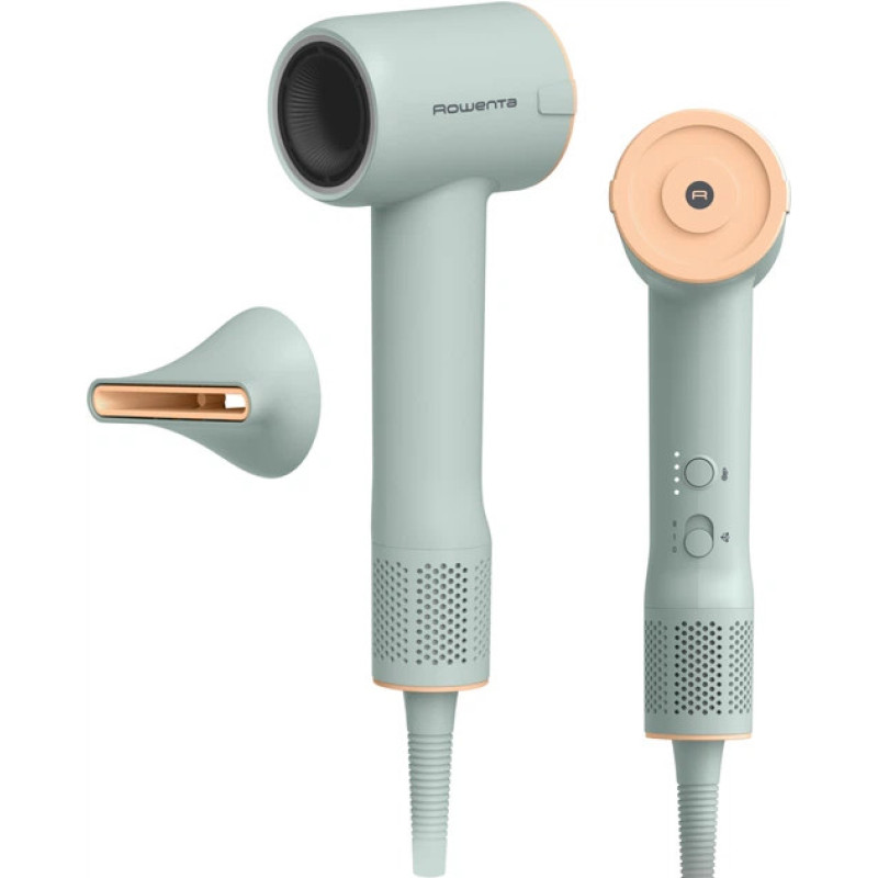 Rowenta Blumia 1300W hair dryer provides fast and controlled hair drying. A professional digital motor delivers a strong airflow for efficient performance. Three temperature settings and two speed levels allow flexible styling. Ionic technology reduces static and improves smoothness. Cool air function helps set the hairstyle.