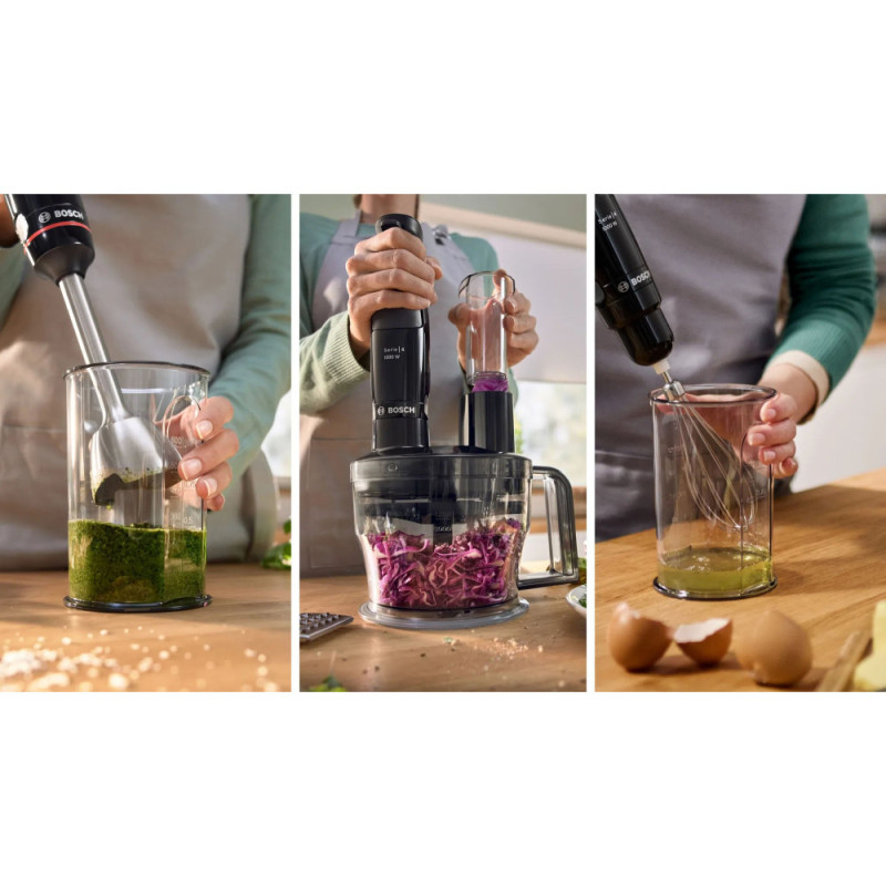 The Bosch MSM4B670 hand blender (1000W, black) comes with a blending attachment, chopper, and whisk. Perfect for sauces, creams, smoothies, and dough.
