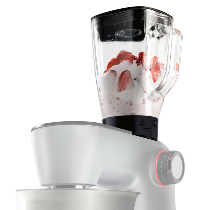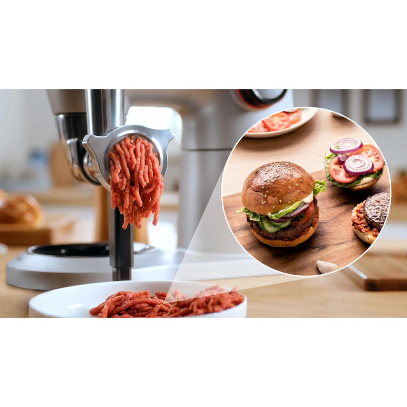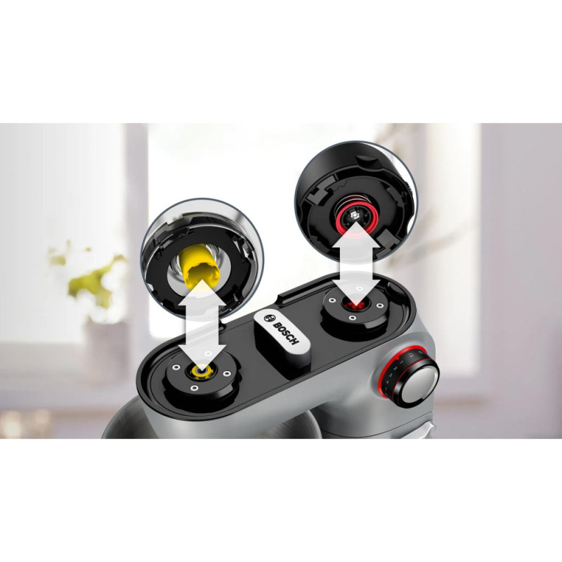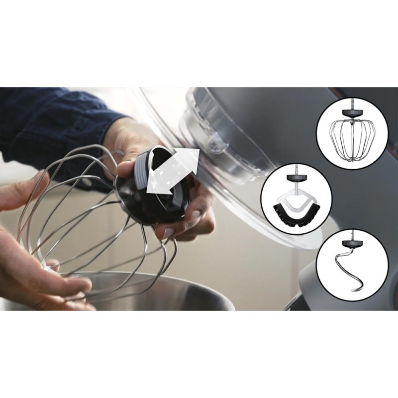 EasyArmLift, smooth start, 3D mixing thoroughly mixes ingredients, electronic power control, compatible with Bosch additional attachments