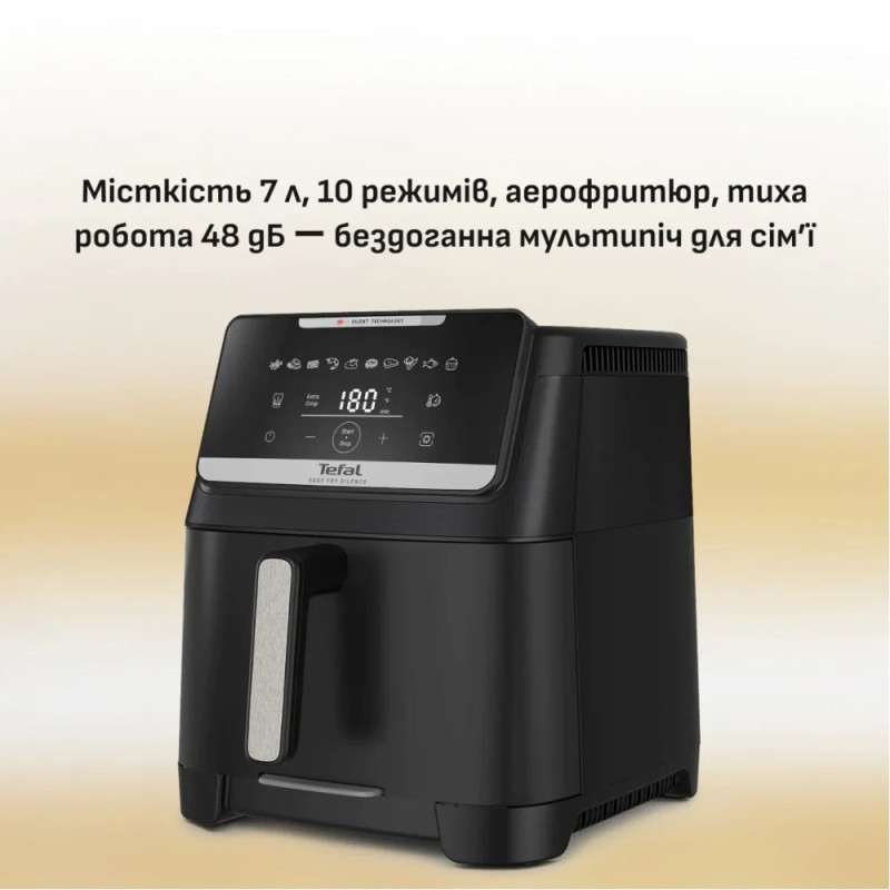 Tefal Easy Fry Silence XXL — a quiet multi-cooker with Silent Technology, a 7-liter bowl, touch controls, and a manual mode ranging from 40 to 220°C. Extra Crisp ensures even hot air circulation for a crispy crust, while Grill Technology adds color and texture without excess oil. There are 10 automatic programs, a removable front panel, and an Easy Clean & Store system.