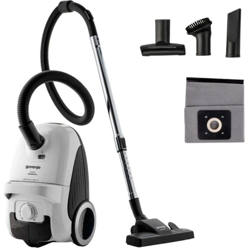The Gorenje VC2221G4EW is a bagged vacuum cleaner with a 3L dust bag. It features a HEPA filter, full-bag indicator, and telescopic tube. Weight — 6.5 kg. Color — white.