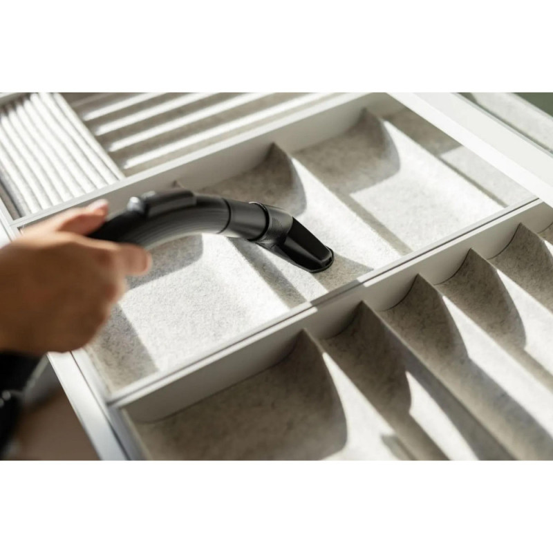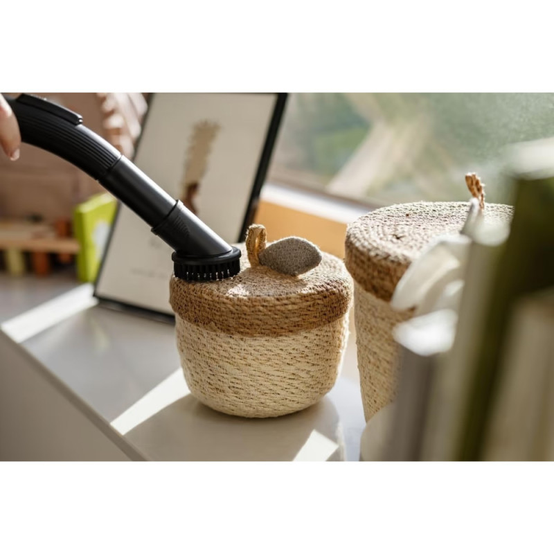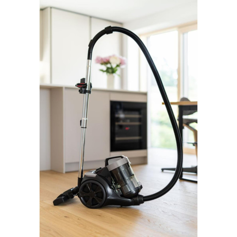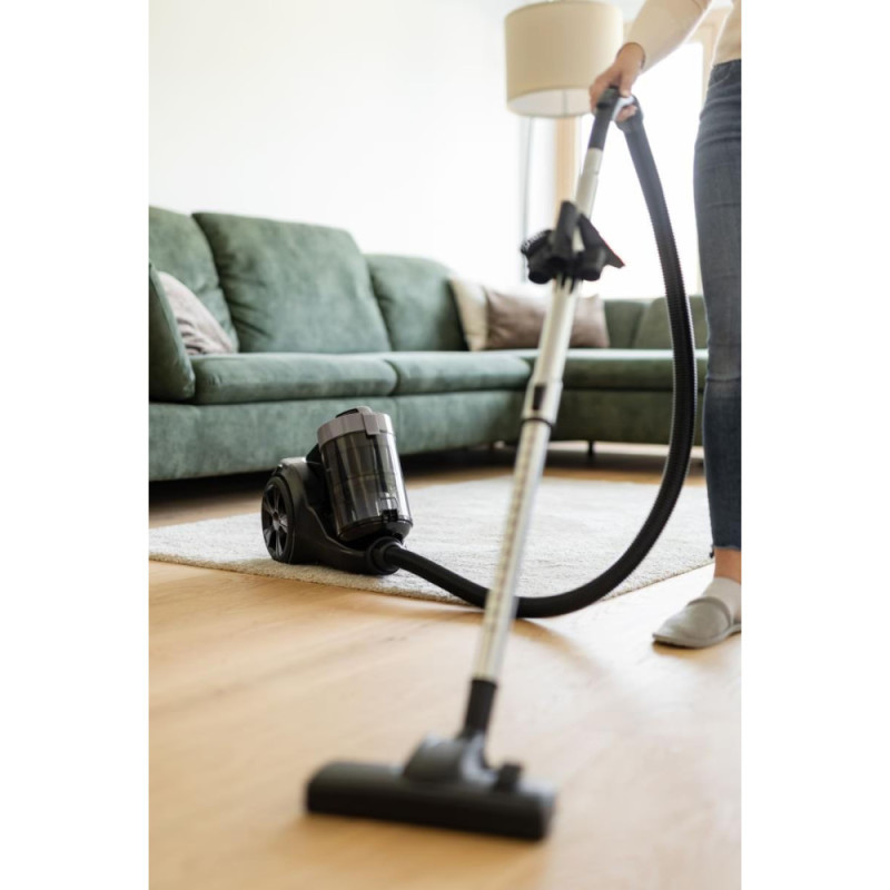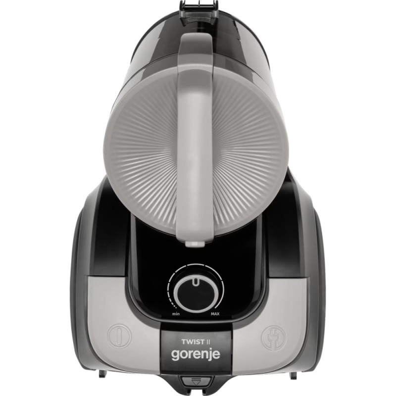 The Gorenje TWIST II bagless vacuum cleaner with an 850 W input power is designed for dry cleaning and collects dust in a 3.3-liter plastic container. Its 140 W suction power and 21 l/s airflow support steady cleaning performance on floors and carpets. The HEPA filter captures fine particles to maintain cleaner exhaust air. The telescopic tube and pivoting handle increase maneuverability. Rubber wheels and a well-balanced body help protect surfaces during movement.