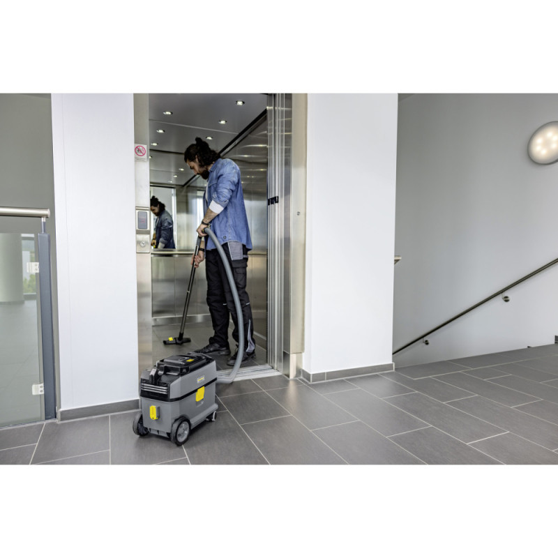 The professional cordless vacuum cleaner Karcher T 10/1 Bp delivers strong suction and quiet operation using the 36 V battery platform. Compact and tip-resistant, it features a 10 L container and an integrated accessory organizer. Made with recycled materials, it is eco-friendly. Optional HEPA filter ensures excellent air purification. Perfect for professional cleaning and everyday use in areas with high hygiene requirements.