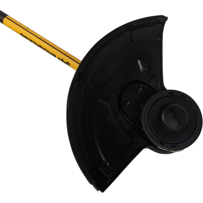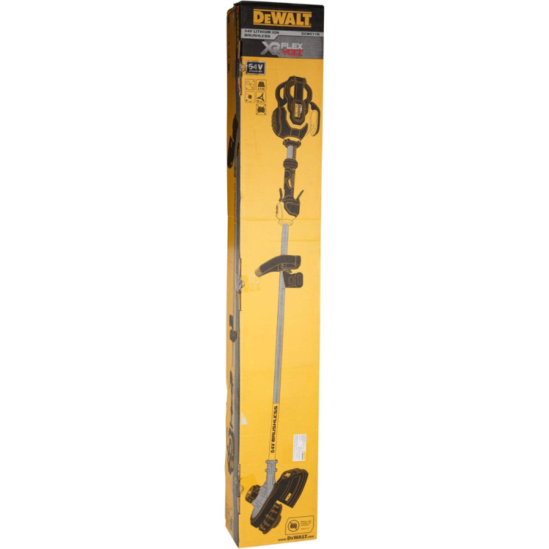 The DeWALT DCM571N cordless garden trimmer is designed for lawn maintenance and clearing dense vegetation. A 38 cm cutting width supports efficient work across large areas. The brushless motor with a metal housing is built for demanding tasks. Two speed ranges allow adjustment to different cutting conditions. Battery and charger are not included.