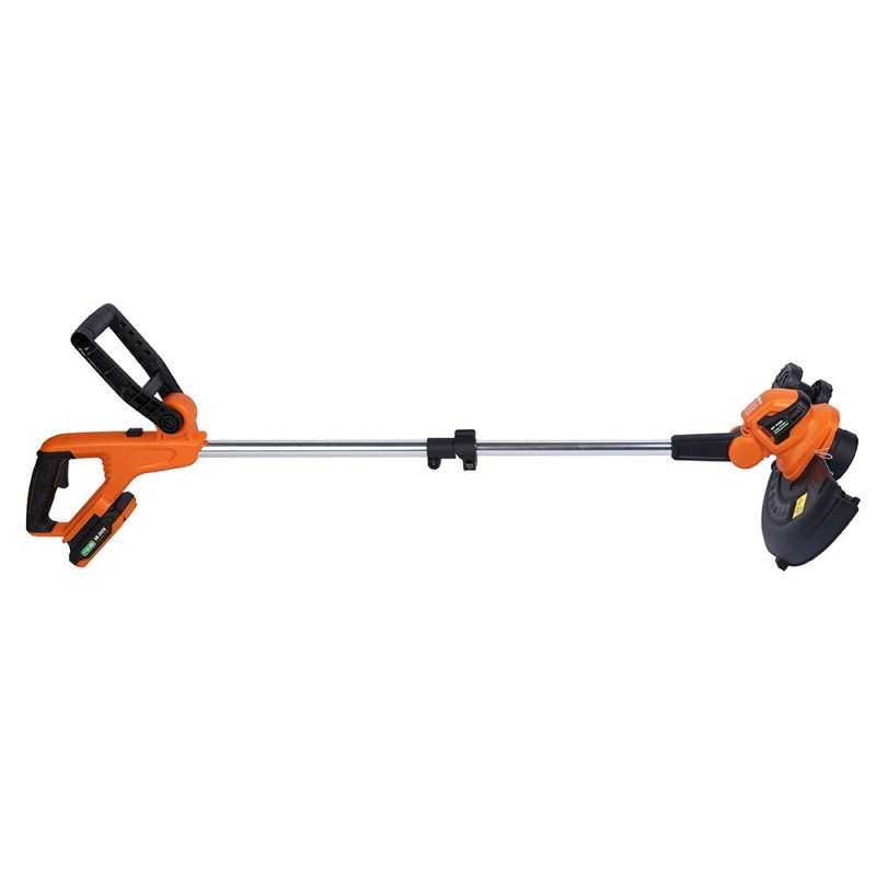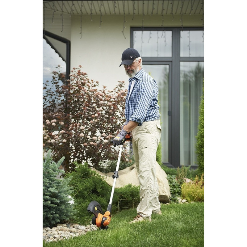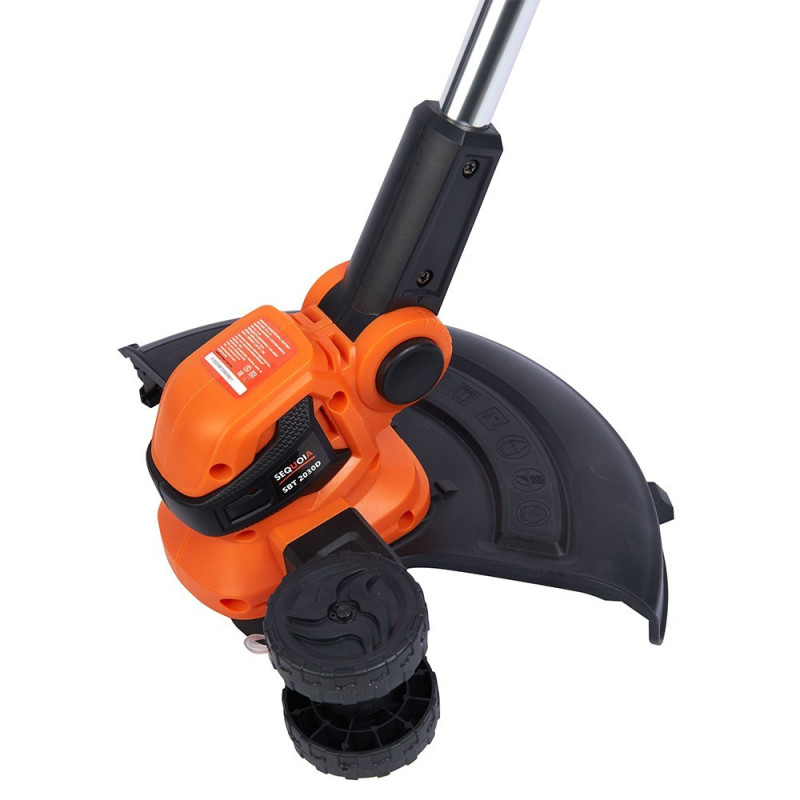 The SEQUOIA SBT2030D-QV cordless trimmer operates on a 20 V 2 Ah battery and features a brushed motor with maximum speed of 9000 rpm. Cutting width of 30 cm suits lawn patches, edges and grassy areas with line. Telescopic aluminum shaft adjusts in length, while the rotating cutting head with tilt angle regulation simplifies work near obstacles. Guide roller maintains consistent cutting height. Weighing 1.8 kg, the trimmer supports prolonged operation.