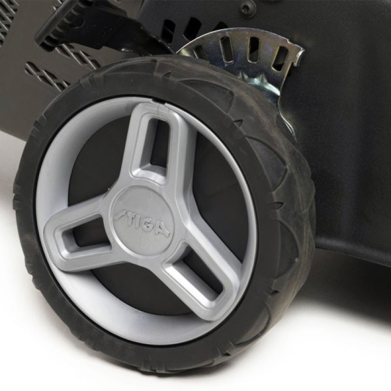 The STIGA Collector 43 petrol lawn mower is designed for maintaining small to medium lawns up to 800 m². This compact model features a reliable STIGA 120 OHV Autochoke engine with 123 cm³ displacement and 1.9 kW power. The 41 cm cutting width and centralized height adjustment in six positions (22–65 mm) deliver an even finish. The spacious 60 l grass collector reduces the need for frequent stops. The foldable handle and front carrying handle make transportation and storage easy.