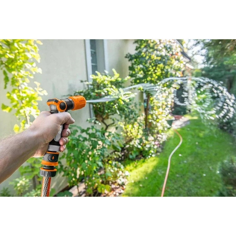 The Neo Tools 15-707 CLICK pistol-grip sprayer with 2 spray modes is a compact tool for daily watering of gardens, lawns, and seedlings. The CLICK system connects to the hose quickly without extra effort. The ergonomic grip stays comfortable during extended use. At 0.242 kg, it is well suited to single-hand operation.