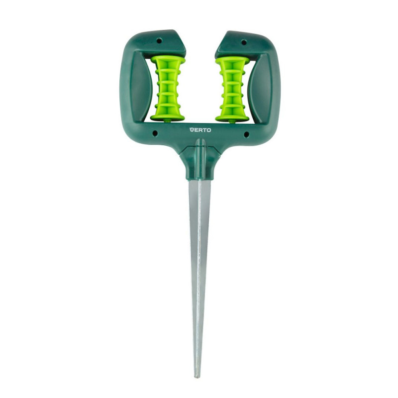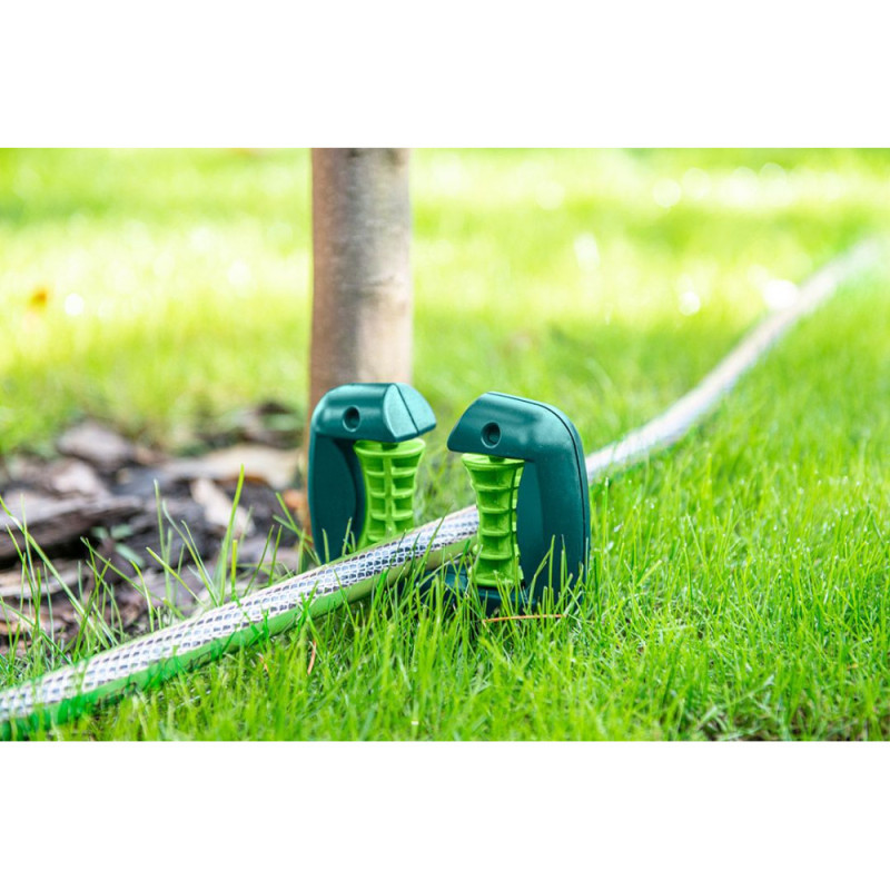 The VERTO 15G851 roller hose guide is used to control the movement of the garden hose during watering. The roller helps to change the direction of the hose and reduces contact with surfaces. The plastic design is designed for regular use in the garden. The accessory is used near paths, corners of buildings, fences, or greenhouses.
