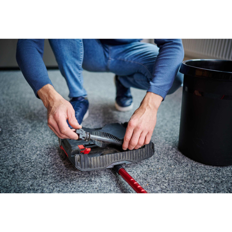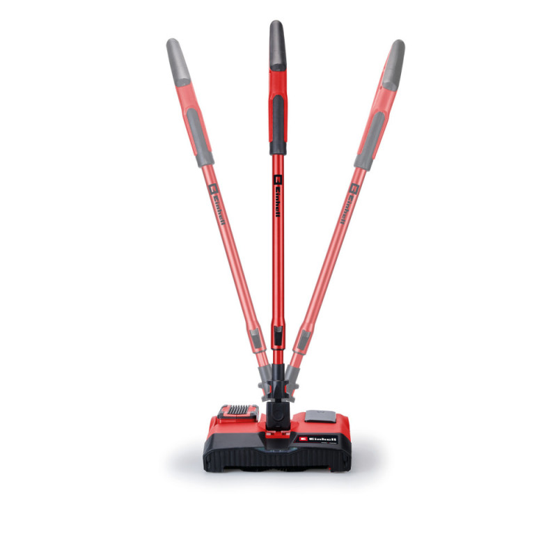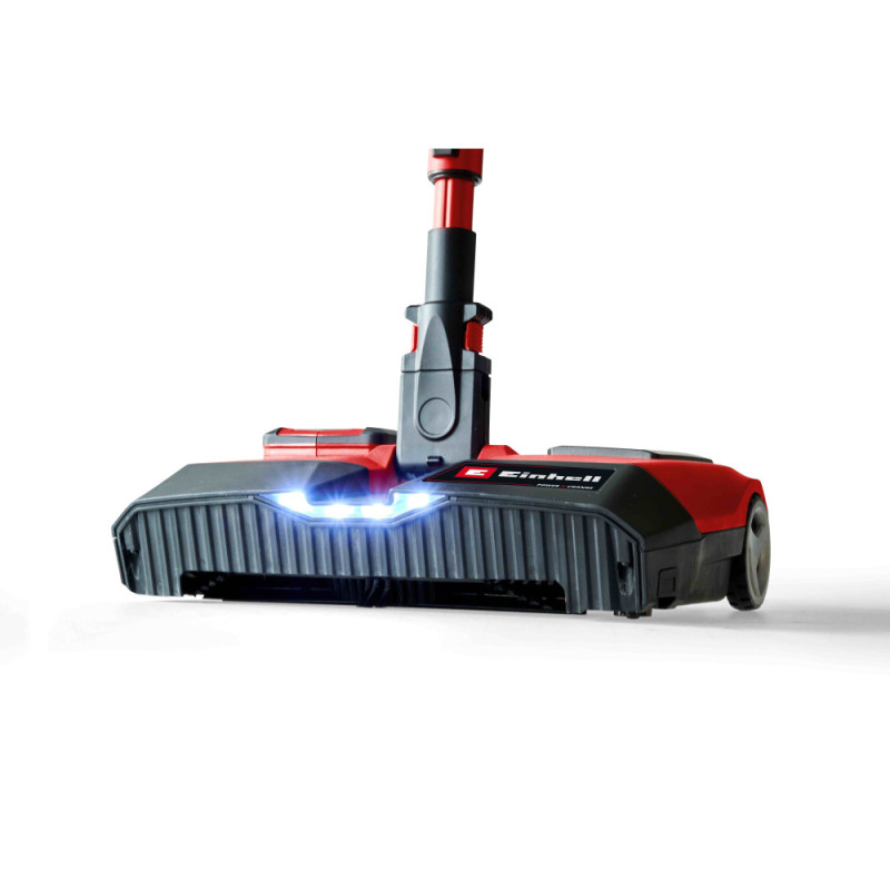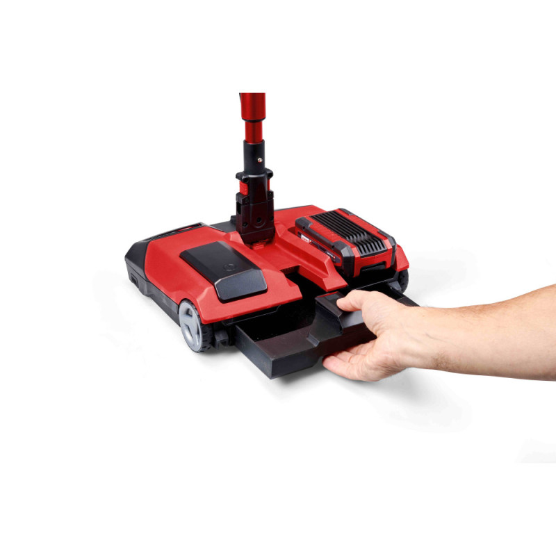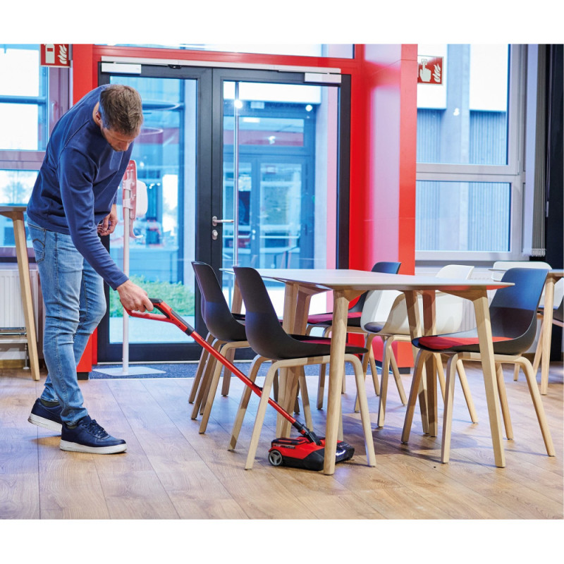 The Einhell TE-FS 18 Li-Solo cordless sweeper is a compact and handy helper for dry cleaning of hard floors and carpets. Equipped with a 250 mm brush, a side brush for cleaning along edges, a 400 ml dirt container and integrated LED lighting. Has a telescopic handle with soft grip, a swivel joint, rubberised wheels and a free-standing function. Compatible with the Power X-Change system. Supplied without battery and charger.