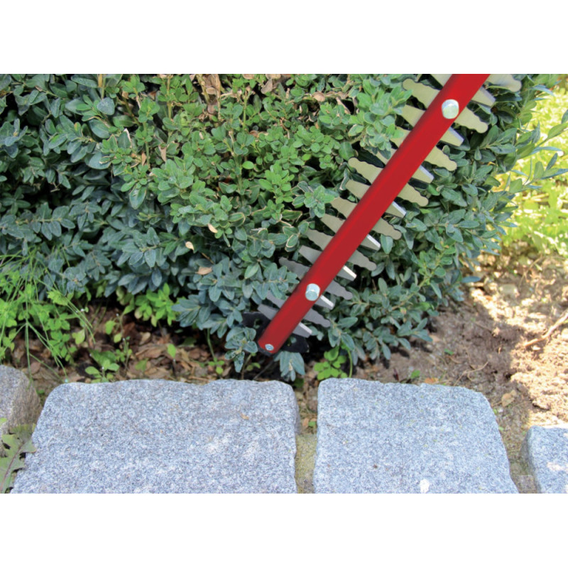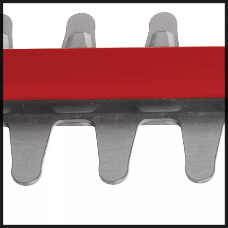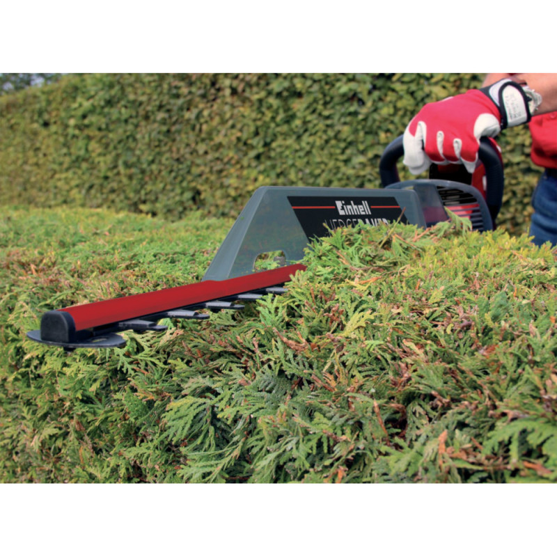 The Einhell GE-EH 6560 650 W electric hedge trimmer for fast and precise trimming of hedges and bushes. A cutting length of 600 mm, a frequency of up to 3000 cuts per minute, and a tooth pitch of 30 mm ensure a clean cut and high productivity. Laser-cut and diamond-ground blades work in tandem with a metal gearbox for durability. An additional front handle and a rotating rear handle with Softgrip improve control and reduce fatigue.