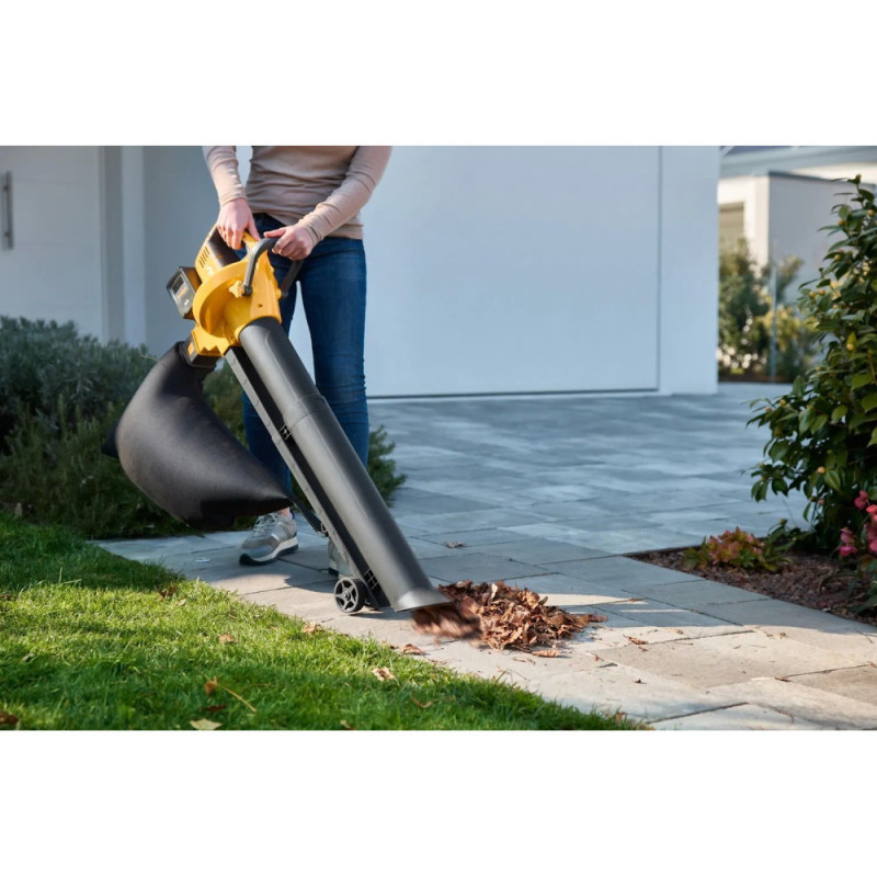 The STIGA VS100eKit cordless blower-vacuum runs on two 20 V 4 Ah batteries and combines blower and vacuum functions. With 576 m³/h airflow and a 45-litre collection bag it quickly gathers leaves and light debris. The built-in shredder reduces the volume of collected material. At 3.64 kg the tool remains easy to handle. The kit includes two batteries and a charger.