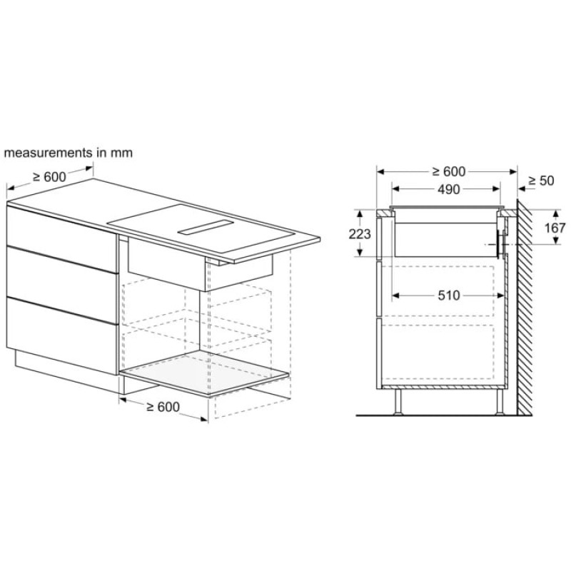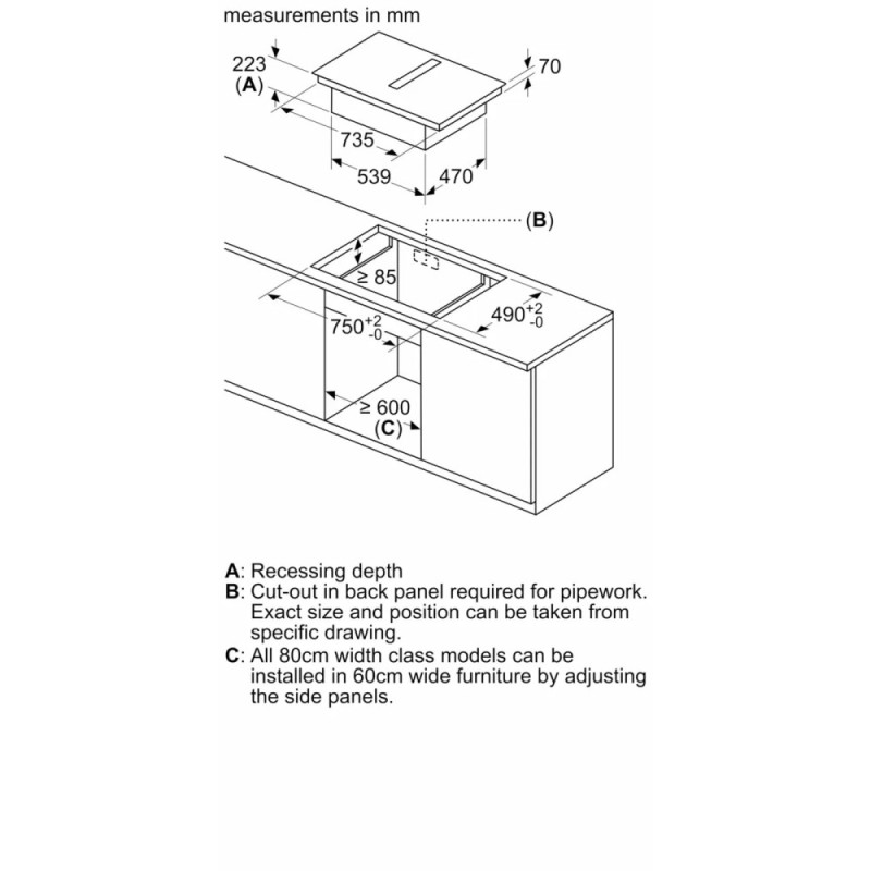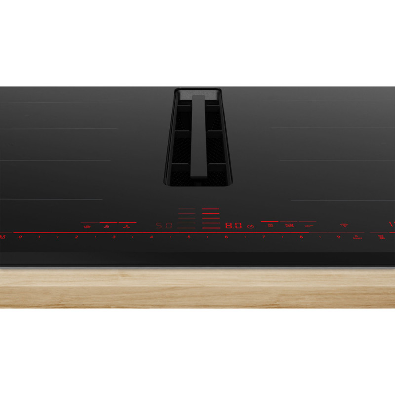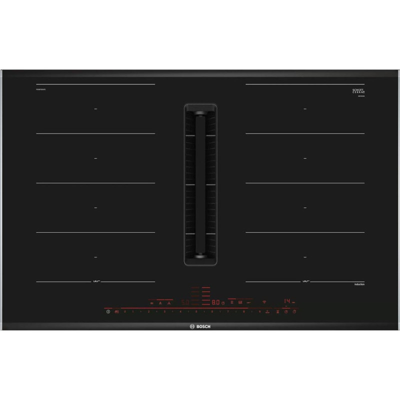 Bosch Serie | 8 PXX875D67E — premium 80 cm induction hob with fully integrated downdraft ventilation (duct or recirculation). 4 zones with 2× varioInduction flex zones, PowerBoost, PanBoost, PerfectFry sensor, MoveMode and fully automatic smart hood controlled via DirectSelect. 7.4 kW total power, up to 615 m³/h extraction, max 74 dB. The ultimate 2025 “2-in-1” cooking solution.