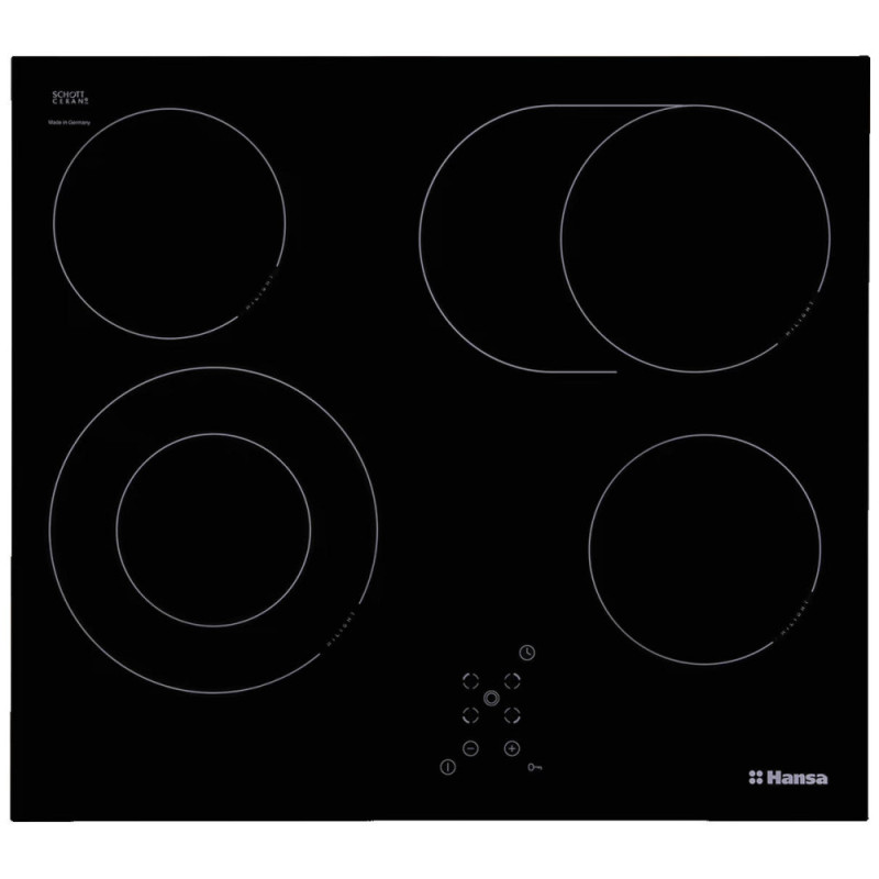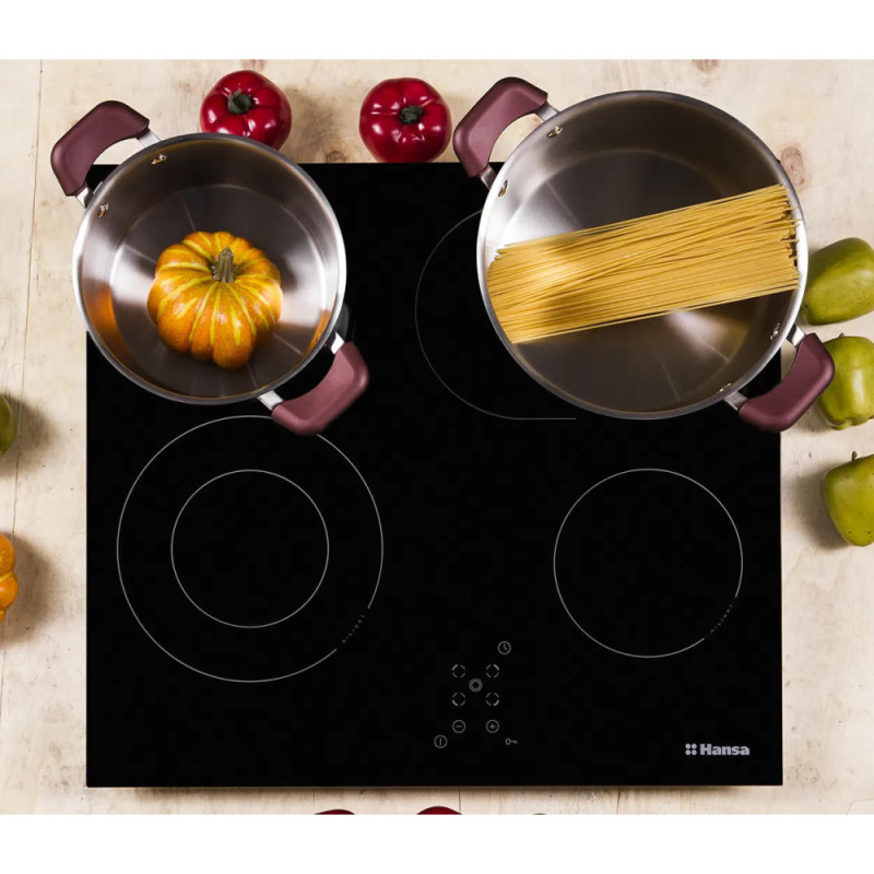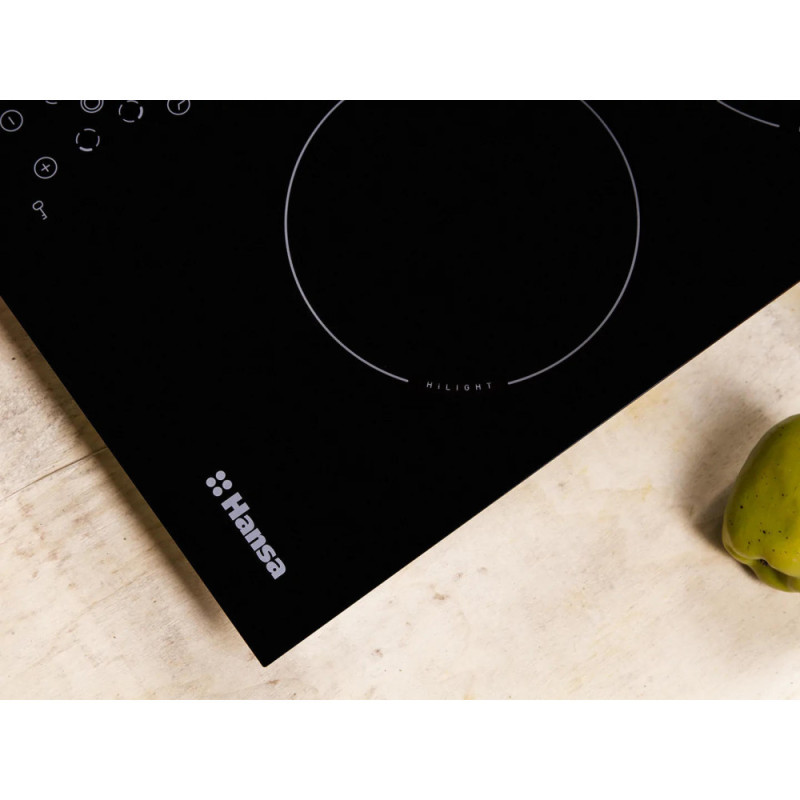 The Hansa BHC66706 electric cooktop combines elegant design with high performance. The smooth ceramic glass surface features four radiant zones and intuitive touch controls for precise cooking. Nine power levels and safety functions ensure reliable operation and easy maintenance.