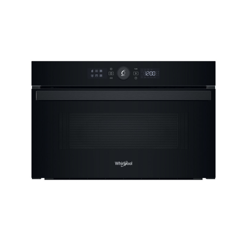 Whirlpool WMD44MB — built-in microwave oven 31 L with electronic touch + rotary control, 1000 W microwave power and 800 W quartz grill. Supports 7 power levels, automatic modes (reheat, cooking, defrost, grill+microwave, Crisper, special programs: potato, meat, vegetables, pizza, popcorn, etc.). Stainless steel interior, timer, child lock, door opens downward, 32.5 cm turntable. Black body, dimensions 38.5 × 59.5 × 46.8 cm (niche 38–38.2 × 55.6–56.8 × 55 cm). Reliable and feature-rich model for modern kitchens with full grill function.