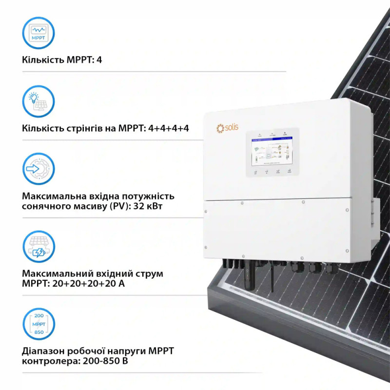 The Solis S6-EH3P20K-H three-phase hybrid inverter delivers 20 kW nominal power for energy storage systems with high-voltage batteries. Four MPPT trackers with 200–850 V range support PV arrays in different orientations up to 32 kW total input. Parallel operation of up to 6 units scales the system to 120 kW. Backup switch time under 10 ms maintains stability for critical loads. 97.5% efficiency and LFP battery compatibility suit large residential and commercial installations.