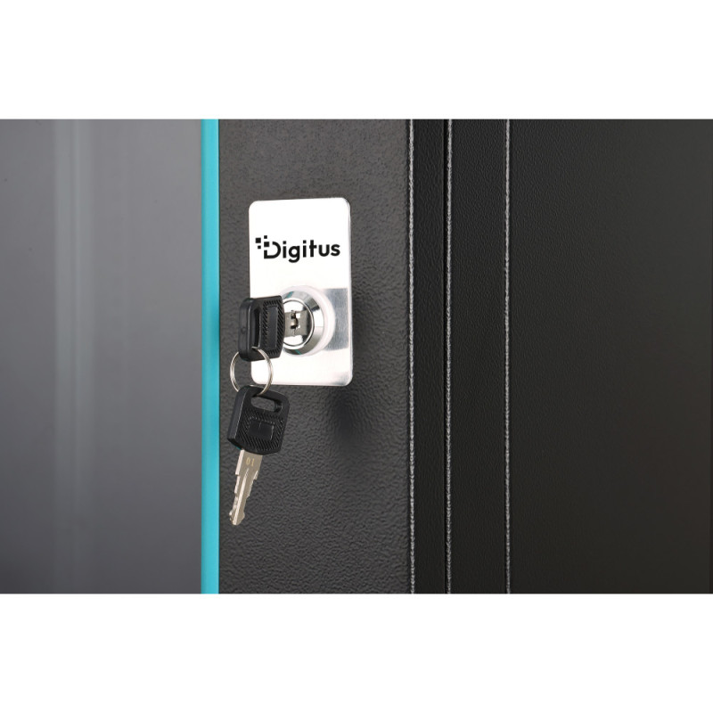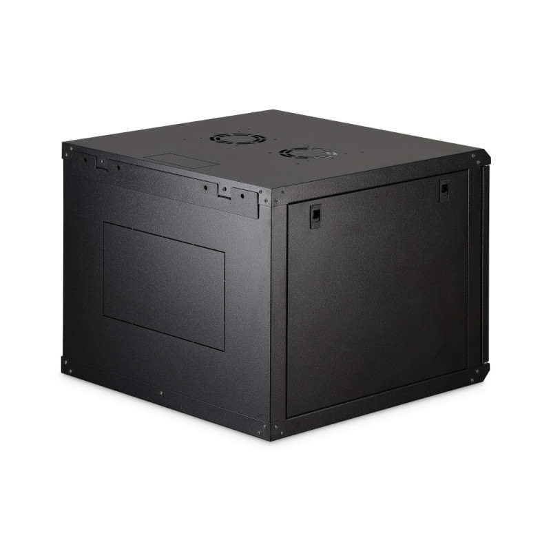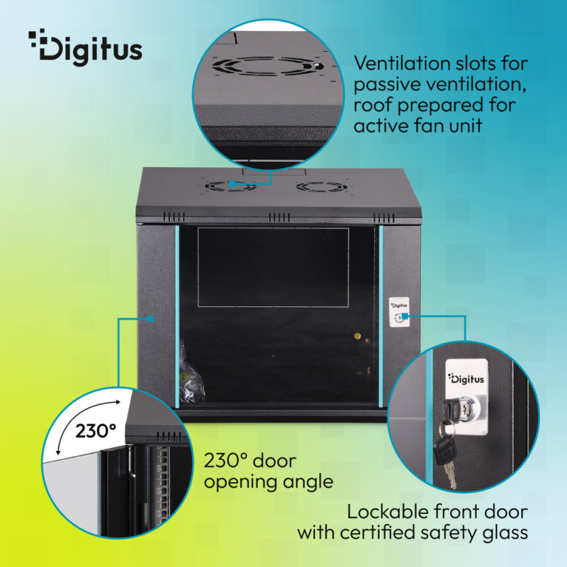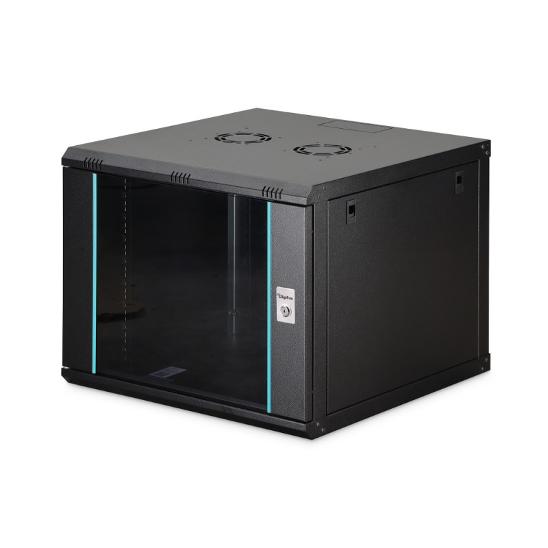 The DIGITUS Dynamic-N 19" wall-mounted cabinet is designed for compact equipment deployment in space-constrained environments. The solid steel construction supports loads up to 60 kg and ensures stable operation. Pre-punched cable entries and optional ventilation support efficient cable and airflow management. Adjustable mounting rails allow flexible installation of various components. Flat-pack delivery improves logistics and storage efficiency.