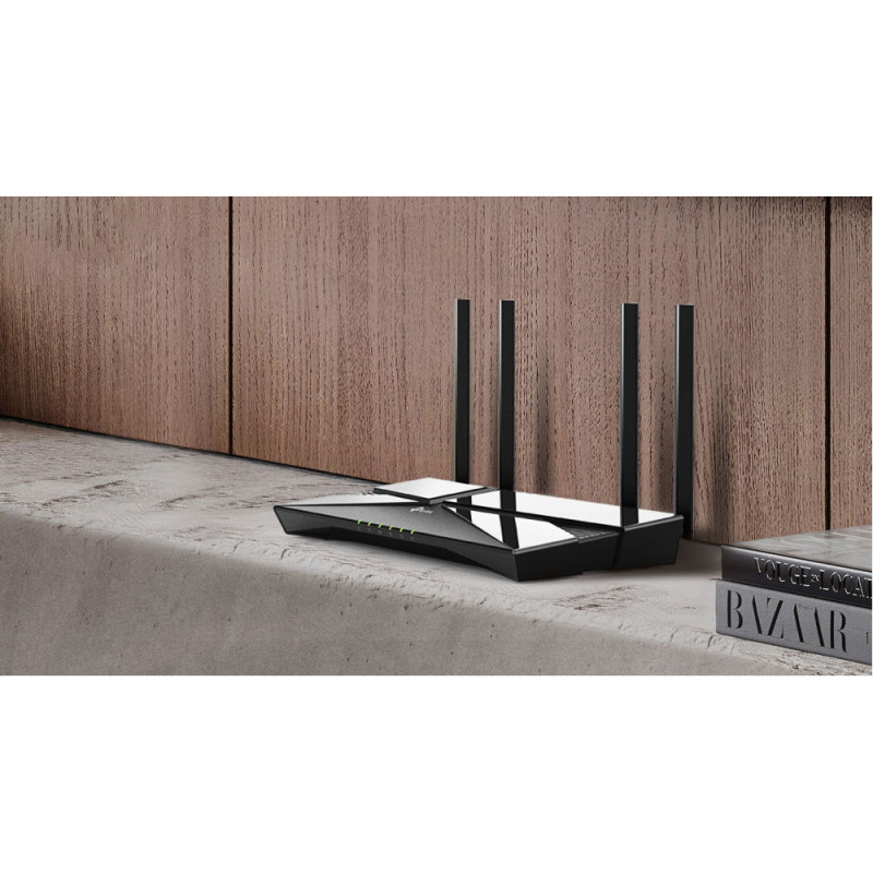 The TP-LINK EX520 router supports Wi-Fi 6 technology with combined speeds up to 3000 Mbps. Four external antennas and Beamforming enhance wireless coverage and signal stability. EasyMesh compatibility enables seamless whole-home networking. Gigabit LAN and WAN ports provide fast wired connections. Network management is available via the Aginet app or web interface.