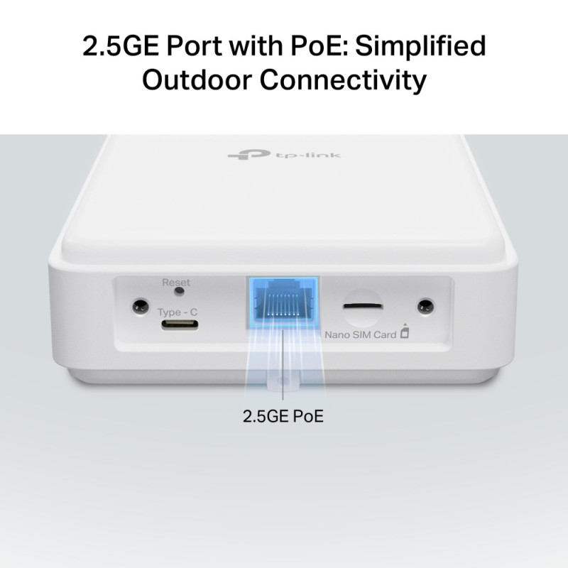 TP-LINK NE200-Outdoor is an outdoor 5G router designed for reliable mobile internet connectivity. It supports 5G, 4G, and 3G networks with high data transfer speeds. The 2.5 Gbps PoE-enabled LAN port allows power and data to be delivered through a single cable. The rugged enclosure is suitable for outdoor environments. Internet access is available instantly after inserting a SIM card.