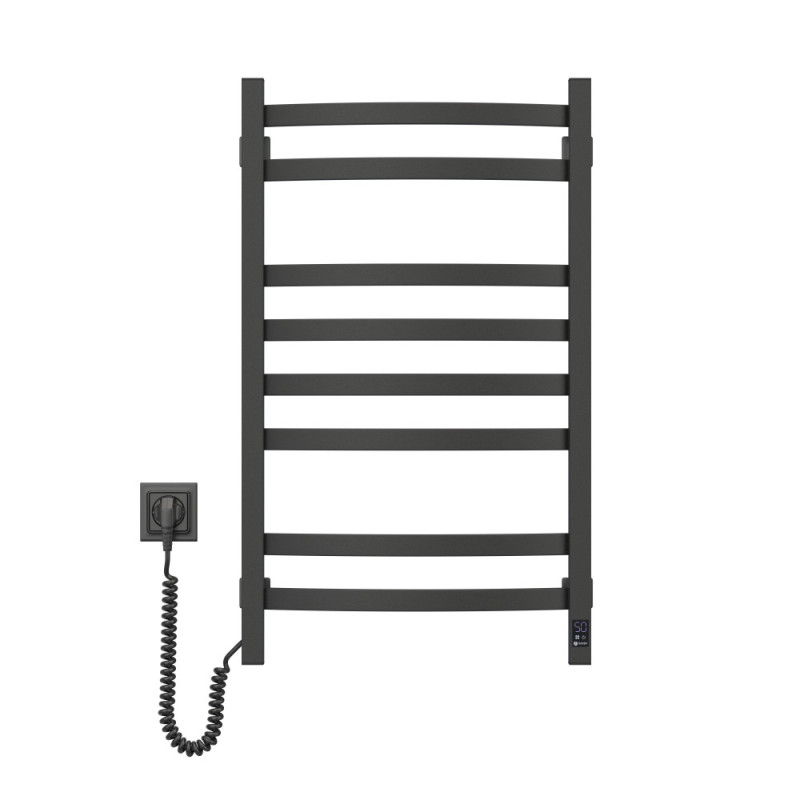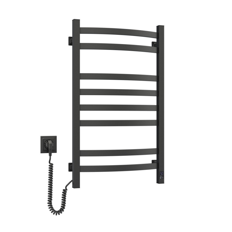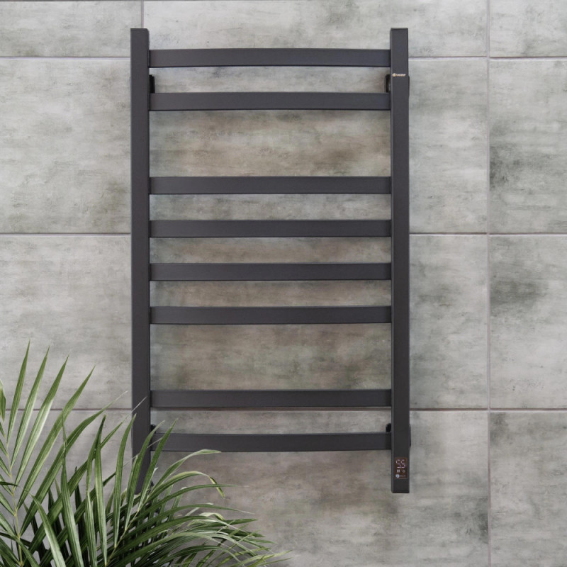 The Navin Avalon 12-203153-4880 electric towel warmer in a black moiré finish combines durable steel construction with a modern touch controller featuring a timer. Eight ladder-style sections ensure even heating and efficient towel drying. With 145 W of power, it maintains stable performance with temperature control up to 55°C. The powder-coated surface provides enhanced corrosion resistance. The left-side cord placement enables convenient installation in various bathroom layouts.