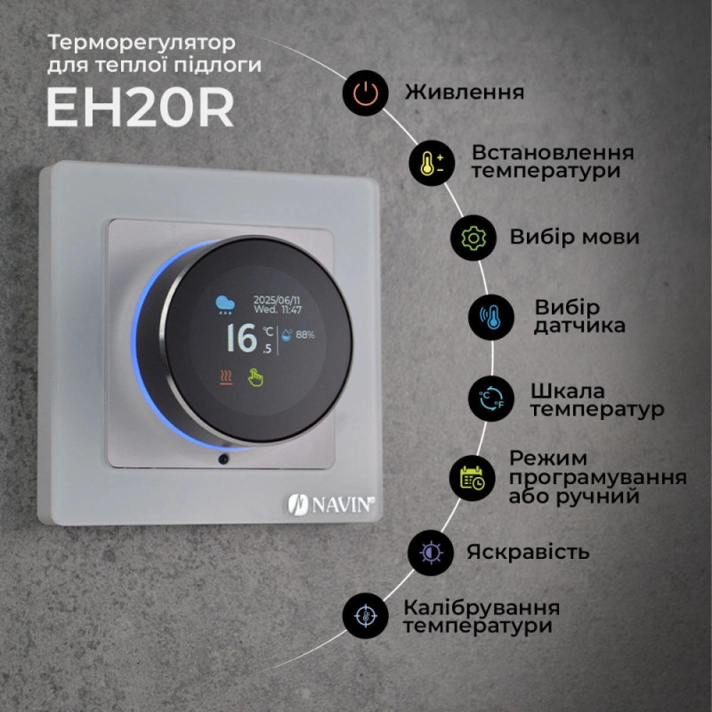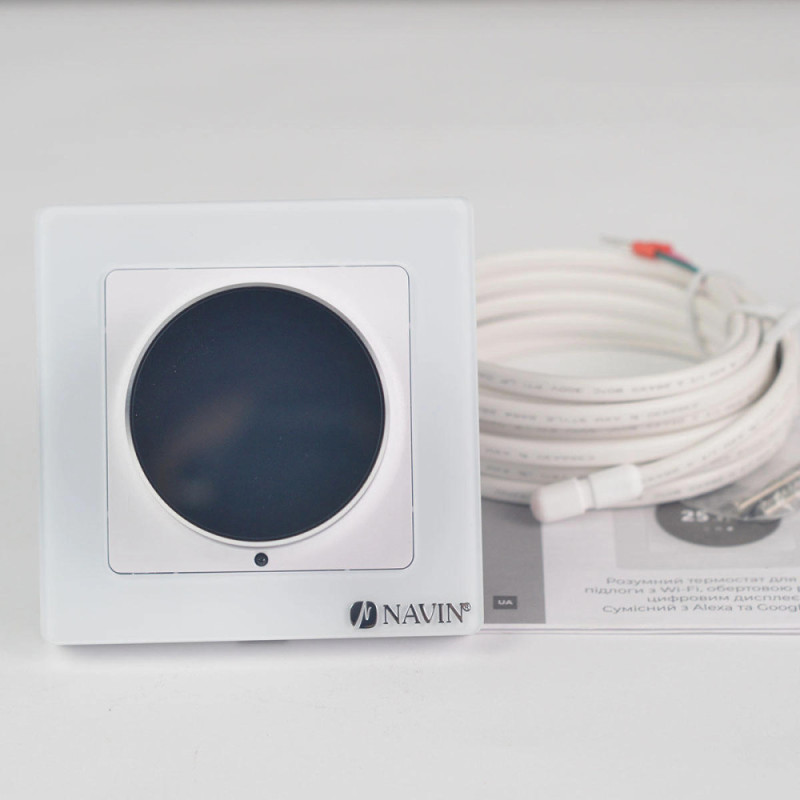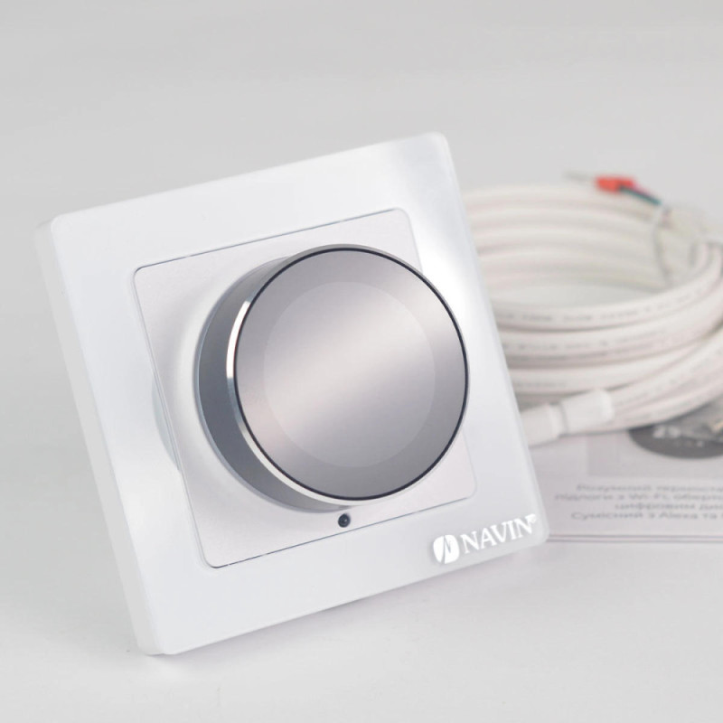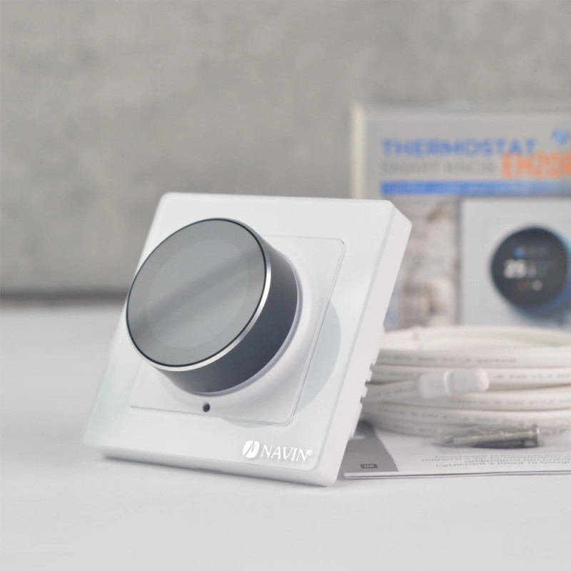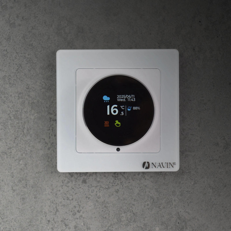 The Navin EH20R-16A thermostat provides precise control of electric underfloor heating via Wi-Fi and the Tuya or Smart Life app. A rotary dial with TFT display enables easy manual temperature adjustments, while the programmable mode optimizes energy use. The NTC temperature sensor ensures measurement accuracy to ±0.1°C, with added features for overheat protection and child lock.