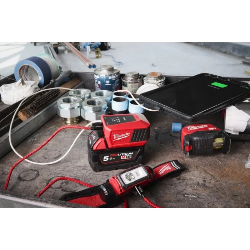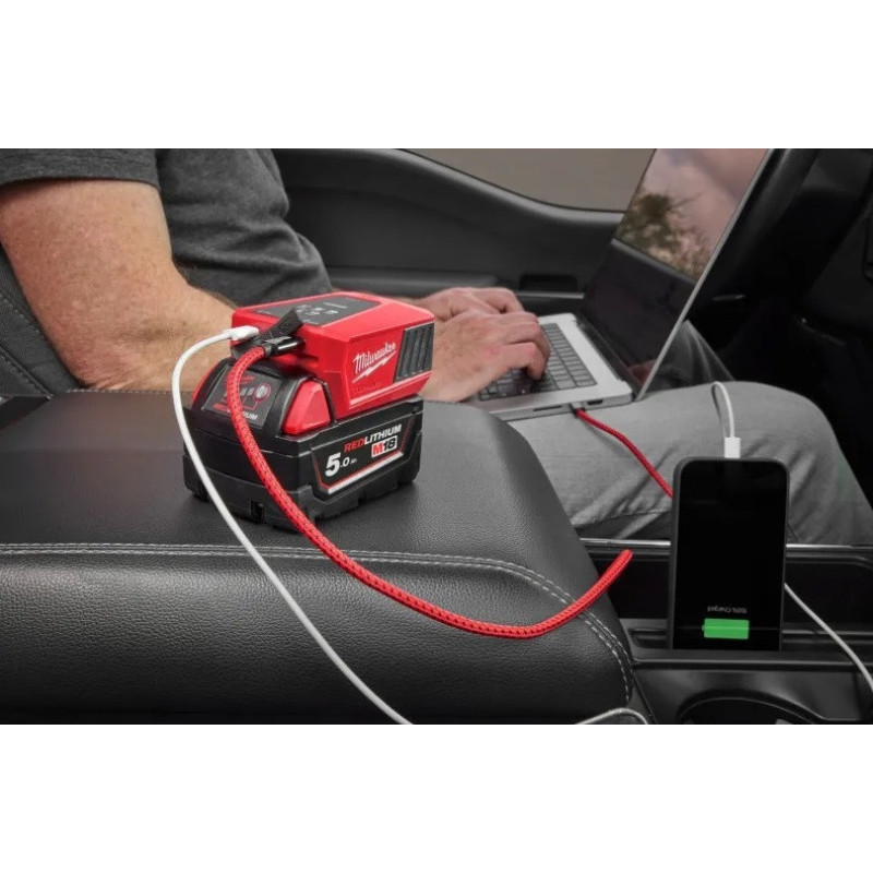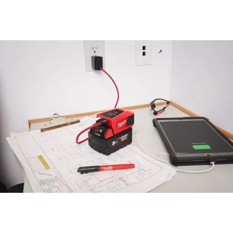 Зарядний пристрій Milwaukee M18TC-0 поєднує функції зарядки та портативного джерела живлення. Працює з акумуляторами платформи M18 і підтримує живлення зовнішніх пристроїв через USB-C. Оснащений двома портами USB-C з різною потужністю. У комплекті передбачено мережевий адаптер і кабель для підключення.
