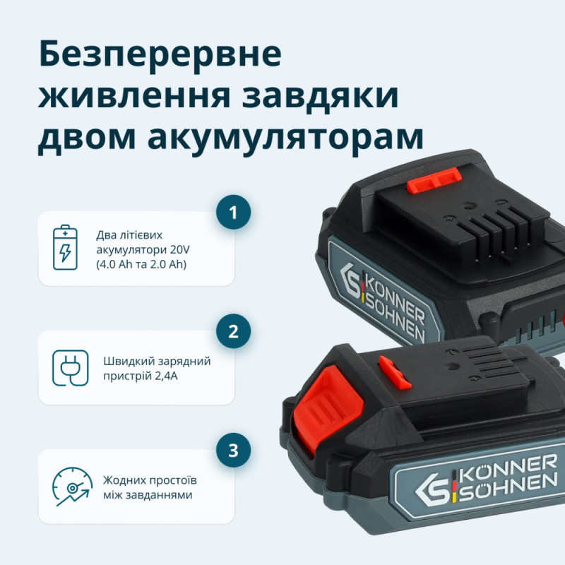Könner & Söhnen Набір із двох акумуляторних інструментів KS IDAGB 20V SET 1 20В дриль ударний, шліфмашина кутова, швидкий ЗП 2.4А акб 1х2А·год+1х4А·год кейс 3кг (KSIDAGB20VSET1)
