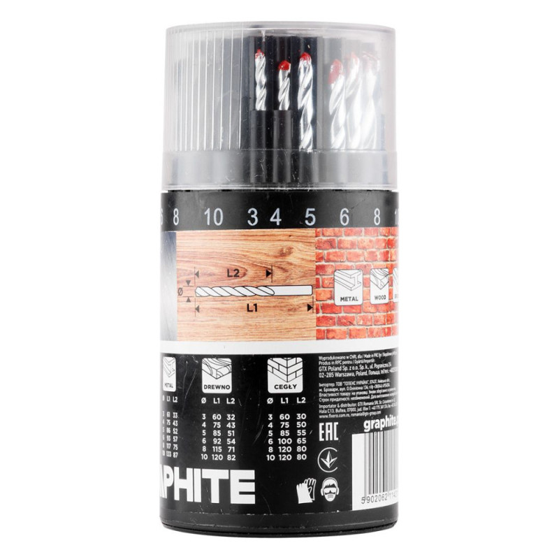 Graphite Набір свердел GRAPHITE по металу, дереву, цеглі: 3-6, 8, 10 мм, 18шт (54T430)