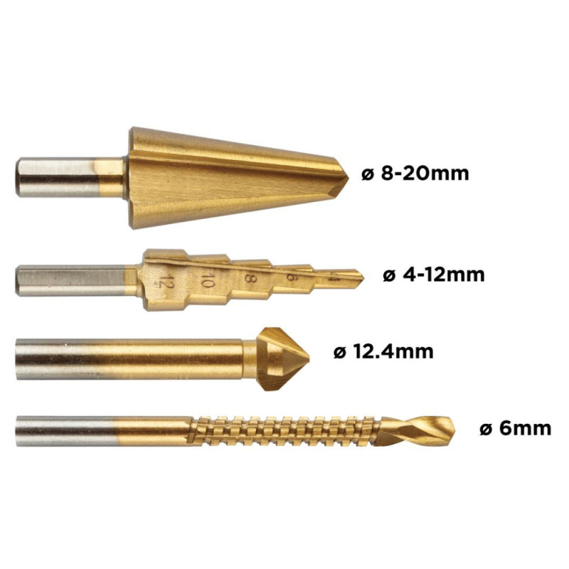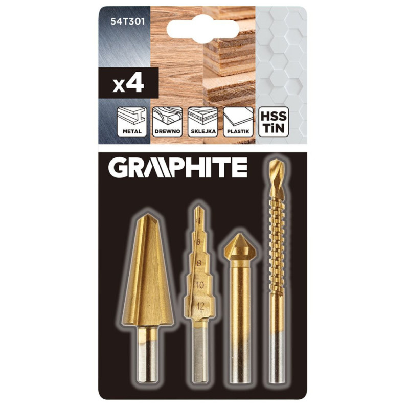 Набір GRAPHITE поєднує чотири інструменти для свердління та точної доробки отворів у металі, пластику та дереві. Покриття TiN підвищує зносостійкість і забезпечує стабільну роботу навіть за інтенсивного використання. Комплект зручний для акуратного розширення отворів, зняття фасок і чистової обробки країв.