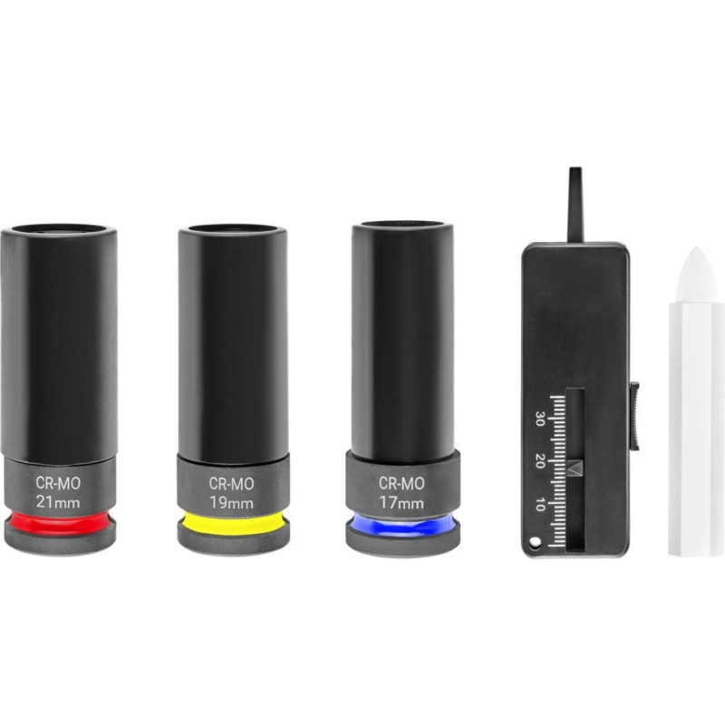 ударна торцева головка 17 мм, ударна торцева головка 19 мм, ударна торцева головка 21 мм, вимірювач глибини протектора (0–35 мм), крейда для шин біла, кейс M-CASE з EVA-вставкою