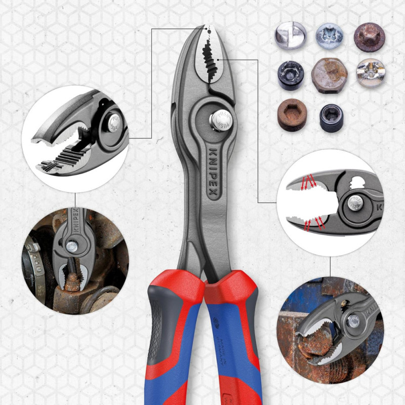 Кліщі KNIPEX TwinGrip призначені для роботи з пошкодженими кріпленнями та дрібними деталями. Поєднання фронтального та бокового захвату забезпечує контроль у різних положеннях. Кнопкове регулювання дозволяє швидко налаштувати інструмент під розмір. Конструкція з коробчатим шарніром підвищує жорсткість і ресурс.