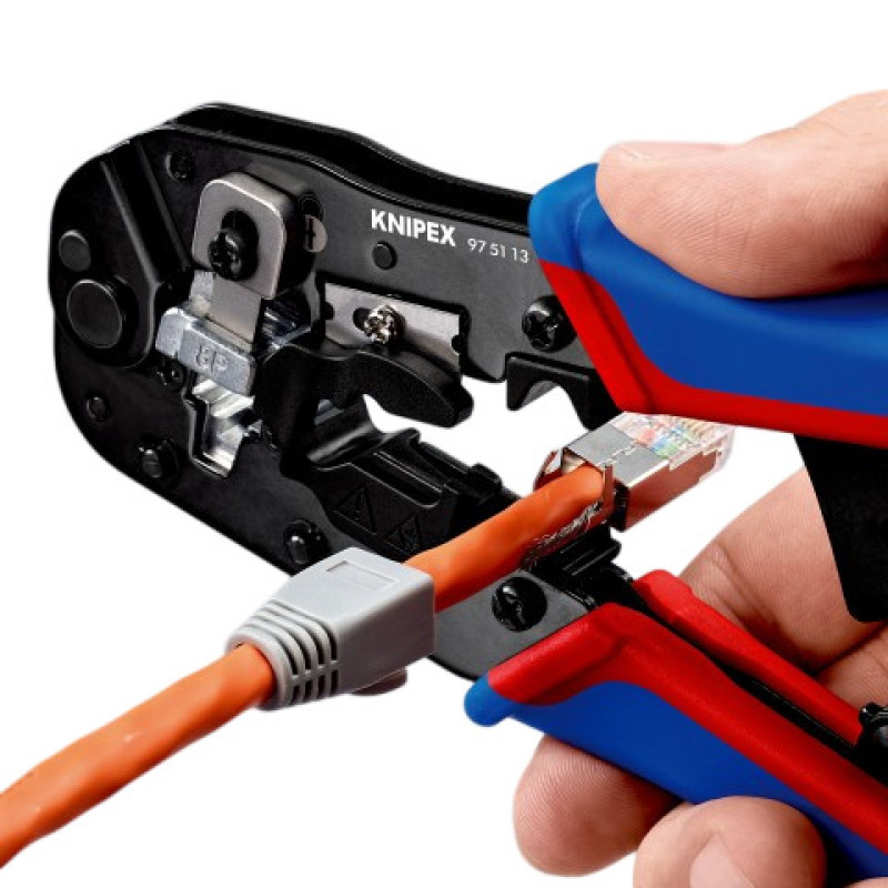 KNIPEX Western — обтискні кліщі для монтажу мережевих кабелів із підтримкою штекерів RJ45. Інструмент поєднує різання, зачистку та обтиск у межах одного корпусу. Паралельний механізм забезпечує рівномірний тиск під час формування контакту. Храповий вузол стабілізує зусилля та покращує повторюваність результату. Передбачена матриця для обтиску фіксатора кабелю.