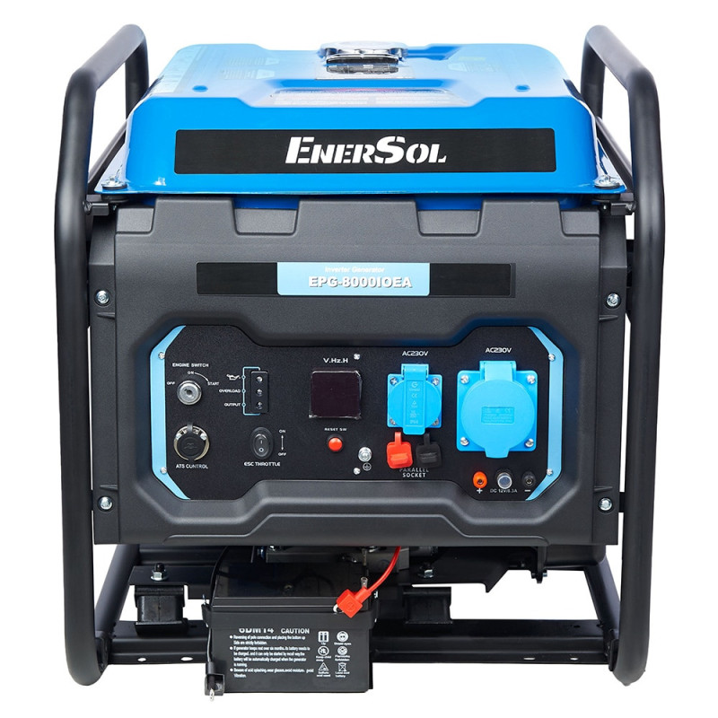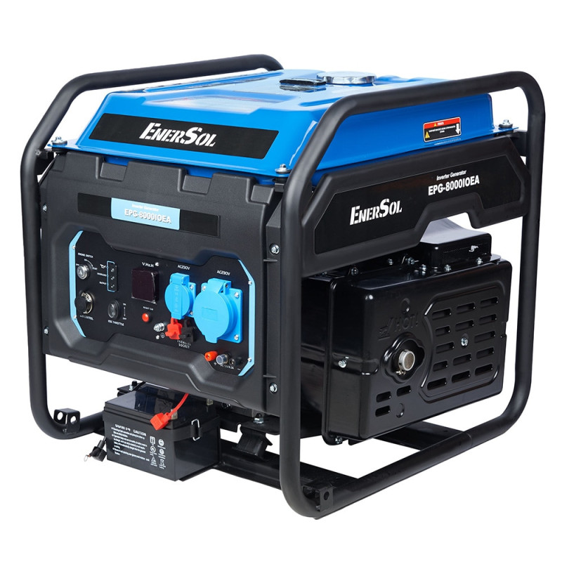 EnerSol EPG-8000IOEA генерує однофазне електропостачання 230 В з частотою 50 Гц, номінальною потужністю 7 кВт та максимальною 8 кВт. Інверторна конструкція формує чисту синусоїдальну хвилю для захисту чутливих пристроїв від коливань. Двигун GP460 чотиритактний з одним циліндром об'ємом 460 см³ та потужністю 12,68 кВт обертається на 3000 об/хв, бак вміщує 25 л бензину з витратою 0,35 л/кВт·год. Рама з сталі вагою 70 кг у габаритах 440x380x460 мм полегшує фіксацію, електростартер з ручним дублюванням спрощує запуск.