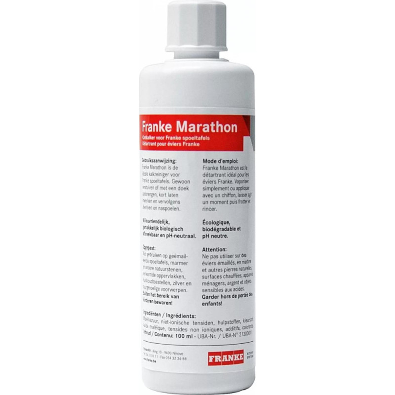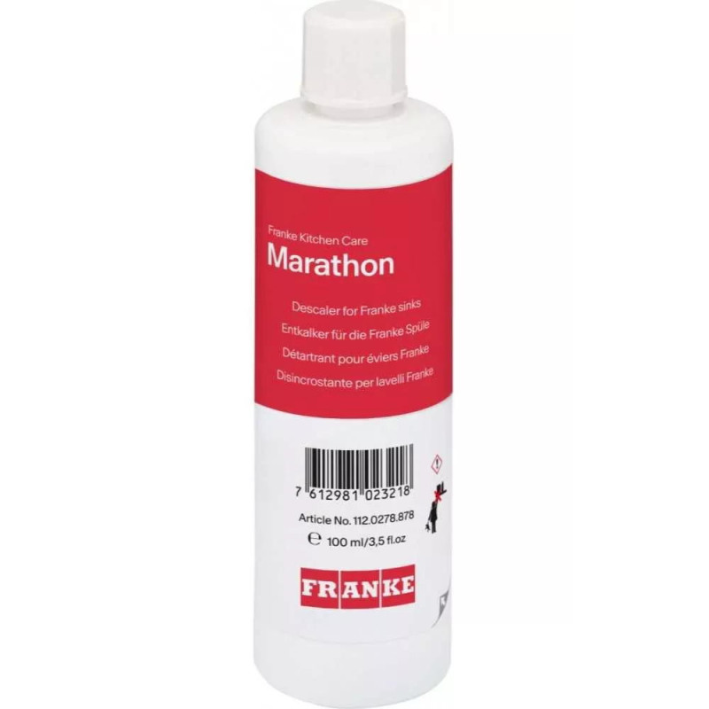 Чистячий засіб Franke Marathon призначений для догляду за мийками з фраграніту та тектонайту. Формула ефективно розчиняє вапняні відкладення та повсякденні забруднення. Засіб працює делікатно, не впливаючи на структуру поверхні. Регулярне використання допомагає підтримувати охайний вигляд мийки. Компактний об’єм зручний для щоденного застосування.