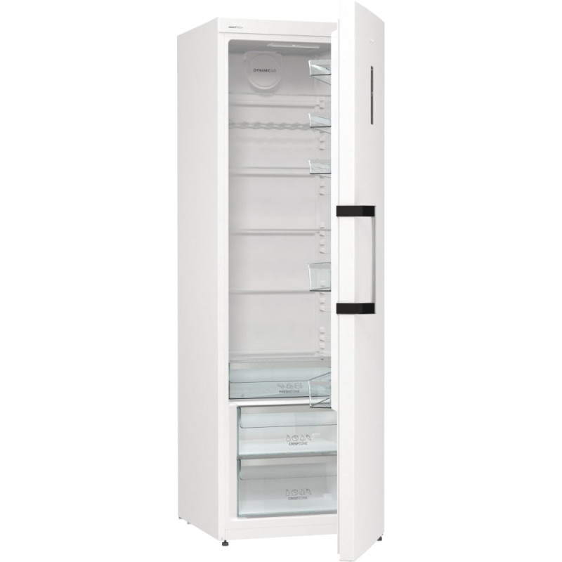Холодильна камера Gorenje створена для зберігання продуктів у просторому внутрішньому об’ємі з продуманою організацією полиць і зон. Система AdaptTech стабілізує температуру під час частого відкривання дверцят, зменшуючи коливання всередині камери. Рівномірне охолодження забезпечується вентиляцією DynamicAir, а контейнер CrispZone з SmartHumidity автоматично контролює вологість для овочів і фруктів. Для м’яса, риби та сирів передбачено окрему шухляду FreshZone зі зниженою температурою.