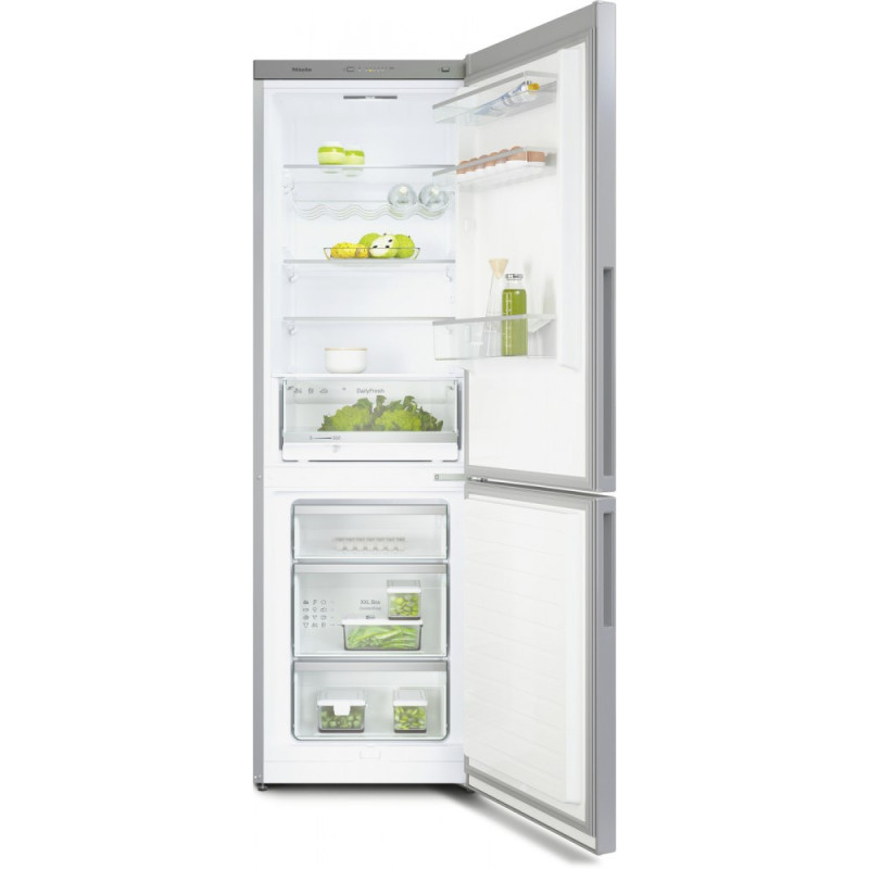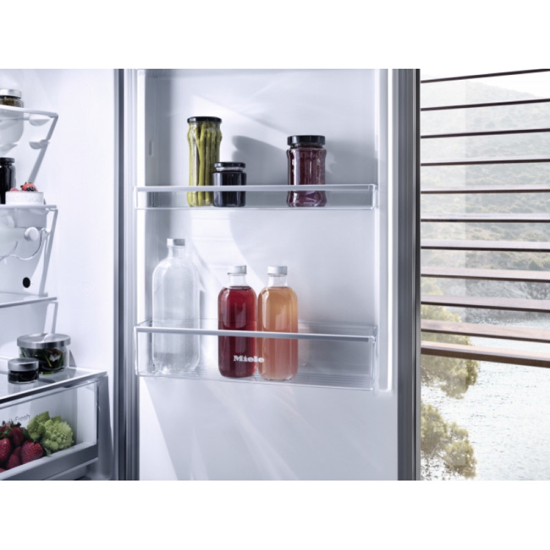Холодильно-морозильна комбінація Miele KD 4172 E Active. Висувний ящик з регульованою вологістю - DailyFresh. Оптимальне охолодження завдяки двом окремим повітряним контурам - DuplexCool. Менш часте розморожування завдяки ComfortFrost. Більше місця для особливо великих заморожених продуктів - ящик XXL. Конструкція без ручок завдяки вбудованій бічній ручці.