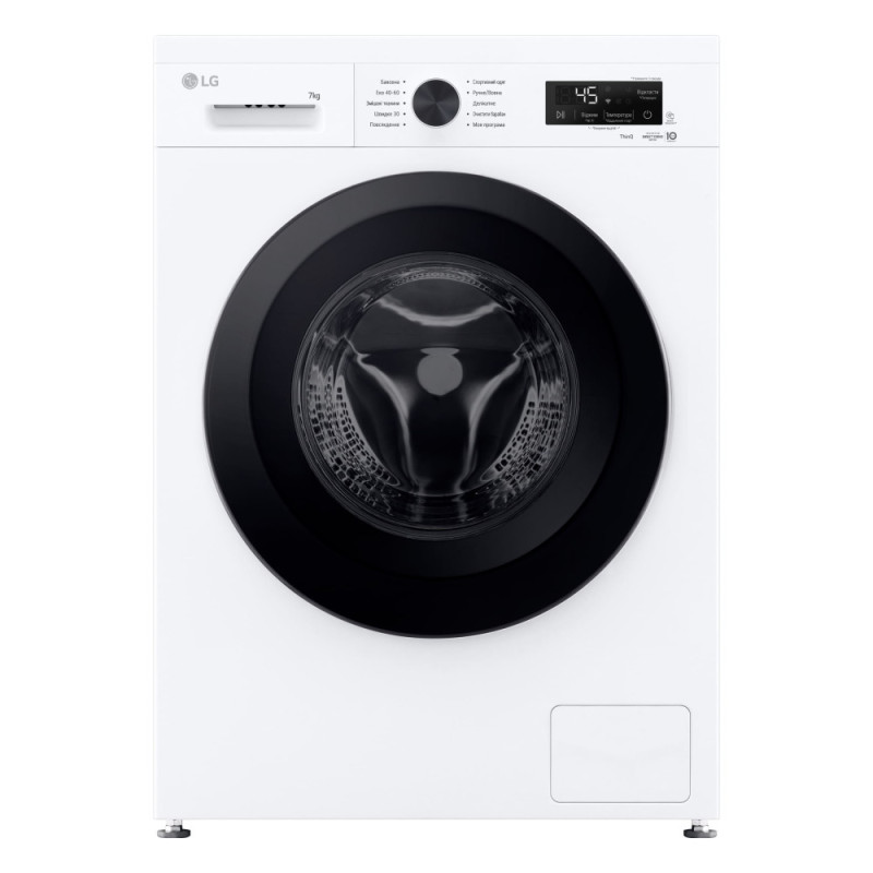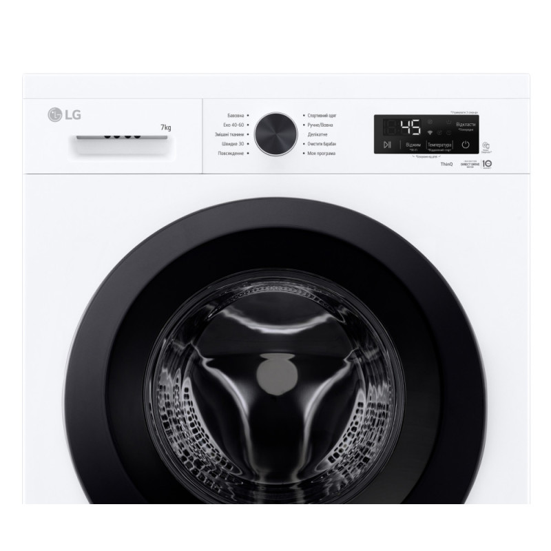 Особливості:Технологія ''6 рухів турботи'' 6 Motion, індикатор залишкового часу, Система зменшення рівня вібрації, Система контролю піноутворення, Технологія контролю напруги (174-400 В), Блокування панелі керування від дітей, індикація режиму "Блокування від дітей, індикація обраних параметрів програми прання, індикація незачинених дверцят, індикація помилок у роботі, затримка завершення циклу прання (3-19 годин), автоматичний перезапуск зі збереженням попередніх налаштувань, Функція обробки парою Steam, відкриття дверей: праворуч, індикація режиму "Відкласти завершення", індикація режму "Віддалений старт", Завантаження додаткових програм через додаток LG ThinQ™ по Wi-Fi, індикація етапу циклу прання, Віддалене керування через додаток LG ThinQ по Wi-Fi
