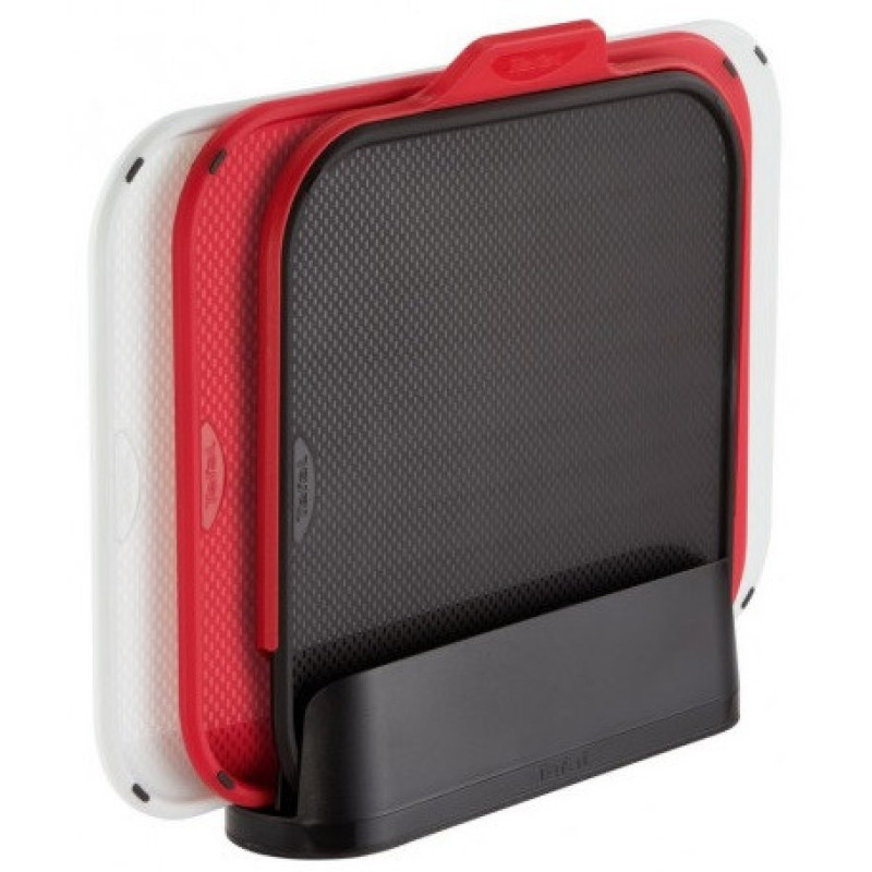 Набір Tefal Ingenio складається з трёx обробних дошок (34.5 x 23.5 x 7 см), до яких додається вертикальна підставка для компактного зберігання. Вони виготовлені з міцного еластичного пластику, що витримує великі навантаження і зберігає гостроту ножів при нарізанні. Матеріал не вбирає запахи продуктів.