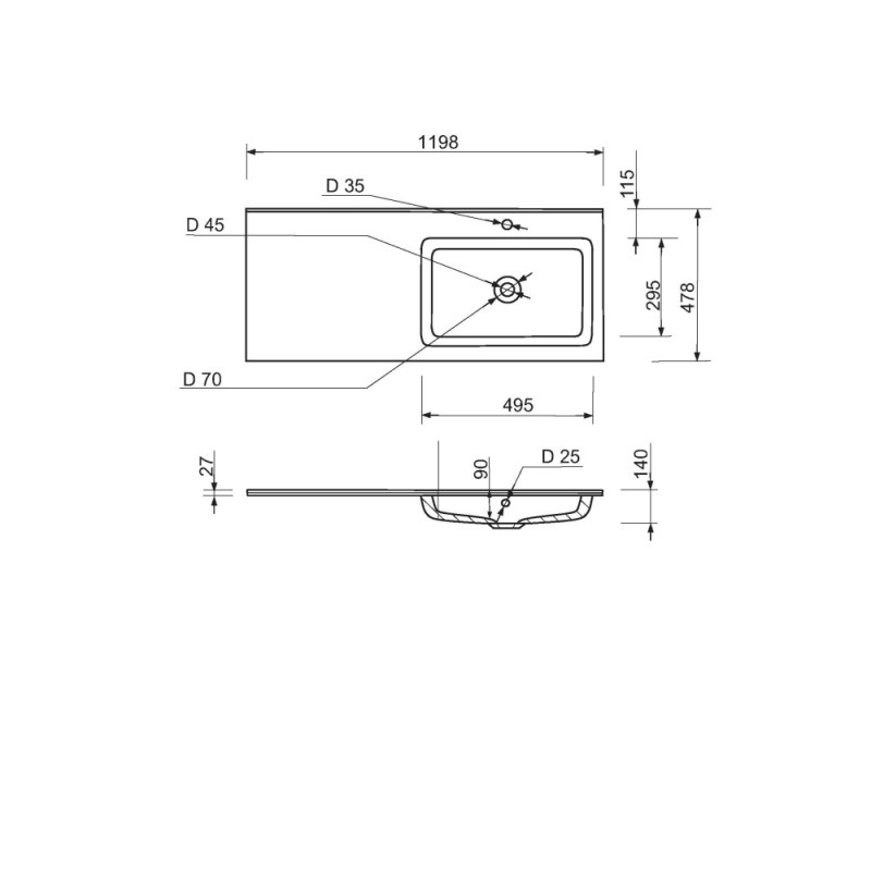 Набір для ванної кімнати Adamant FLATE 120R включає раковину зі штучного каменю, змішувач та сифон Click-Clack. Раковина прямокутної форми з чашею праворуч та крилом ліворуч має розміри 119,8 х 47,8 х 14 см, білий колір та отвір для переливу. Одноважільний змішувач оснащено аератором, металевим важелем та стаціонарним виливом з хромовим покриттям. Пластиковий сифон забезпечує мокрий гідрозатвор, автоматичне відкриття зливу та функцію переливу.