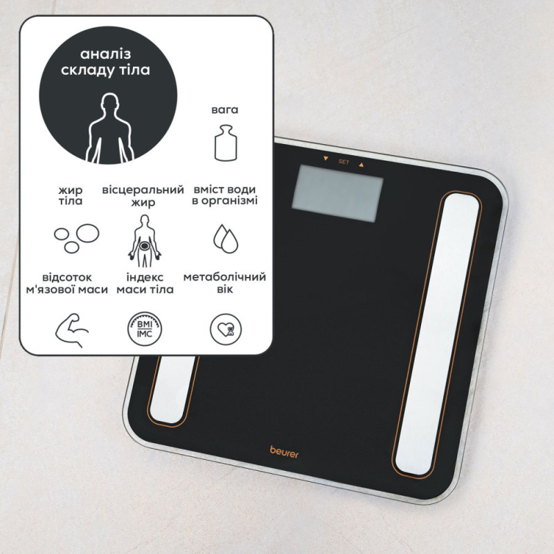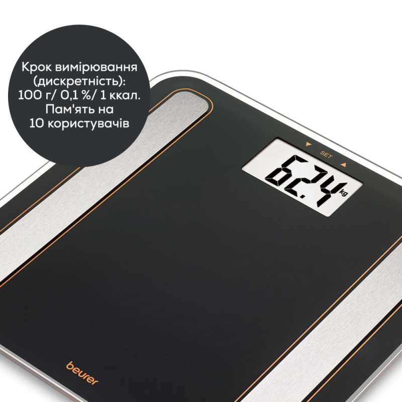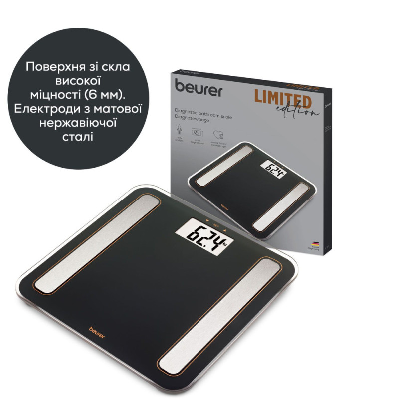Beurer Ваги Beurer підлогові діагностичні, 180кг, підсвіч., дисплея, 1хCR2032, скло,чорний (BF_183_LE_2025)