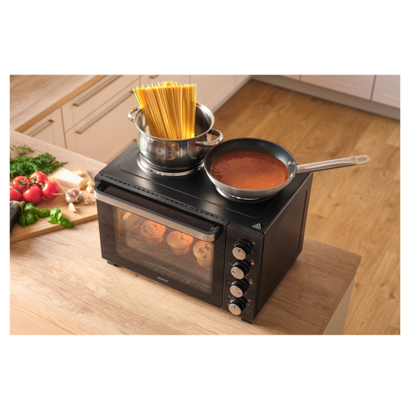 Електрична піч Sencor SEO3500BK об'ємом 35 л із загальною потужністю 3200 Вт поєднує духовку та дві верхні конфорки в одному компактному приладі. П'ять режимів роботи — верхній та нижній нагрів, гриль, конвекція та їх комбінації — охоплюють весь спектр приготування від запікання до випічки. Плавне регулювання температури 90–230 °C та чотири поворотні регулятори забезпечують точний контроль кожного процесу. Вбудоване внутрішнє підсвічування дає змогу стежити за стравою без відкривання дверцят.