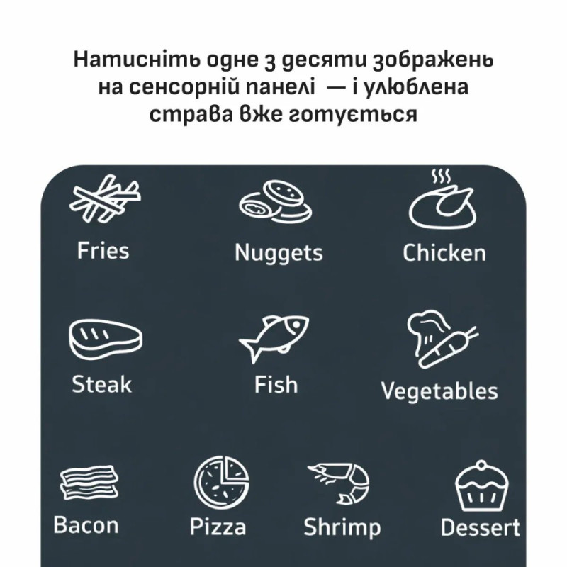 Випічка, Риба, Овочі, Нагетси, Картопля фрі, Курка, Стейк, Піца, Бекон, Креветки, Ручні налаштування
