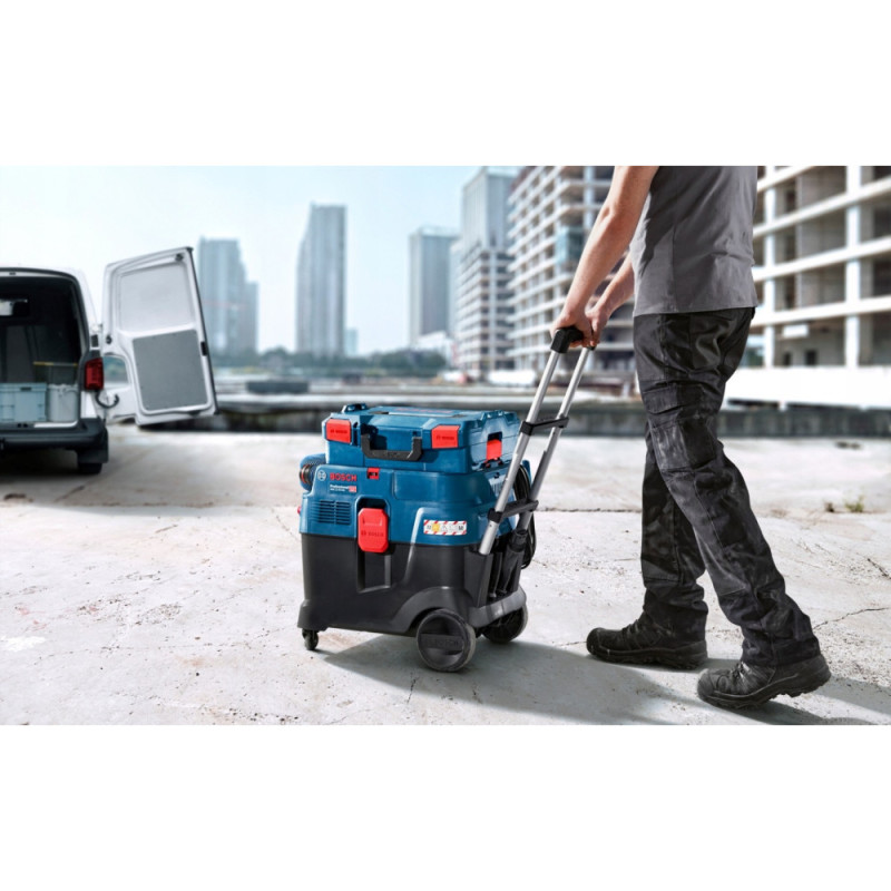 Пилосос Bosch Professional GAS 12-40 MA призначений для сухого та вологого прибирання. Потужність становить 1200 Вт. Оснащений системою очищення фільтра AFC та фільтром класу M. Має антистатичний шланг і антистатичну систему. Використовується контейнер великого об’єму. Конструкція доповнена чотирма колесами для переміщення.