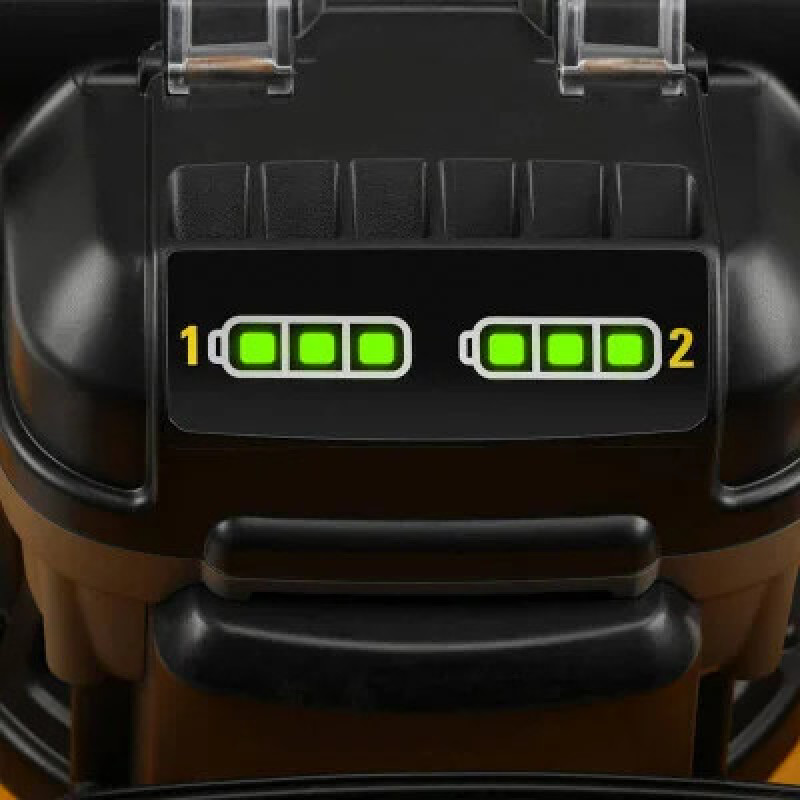 Додатково:LED-індикатори заряду двох акумуляторів на корпусі, телескопічна алюмінієва регульована рукоятка, колеса зі стопорами, бічні ручки для транспортування, сумісність з усією лінійкою DeWalt 18В XR