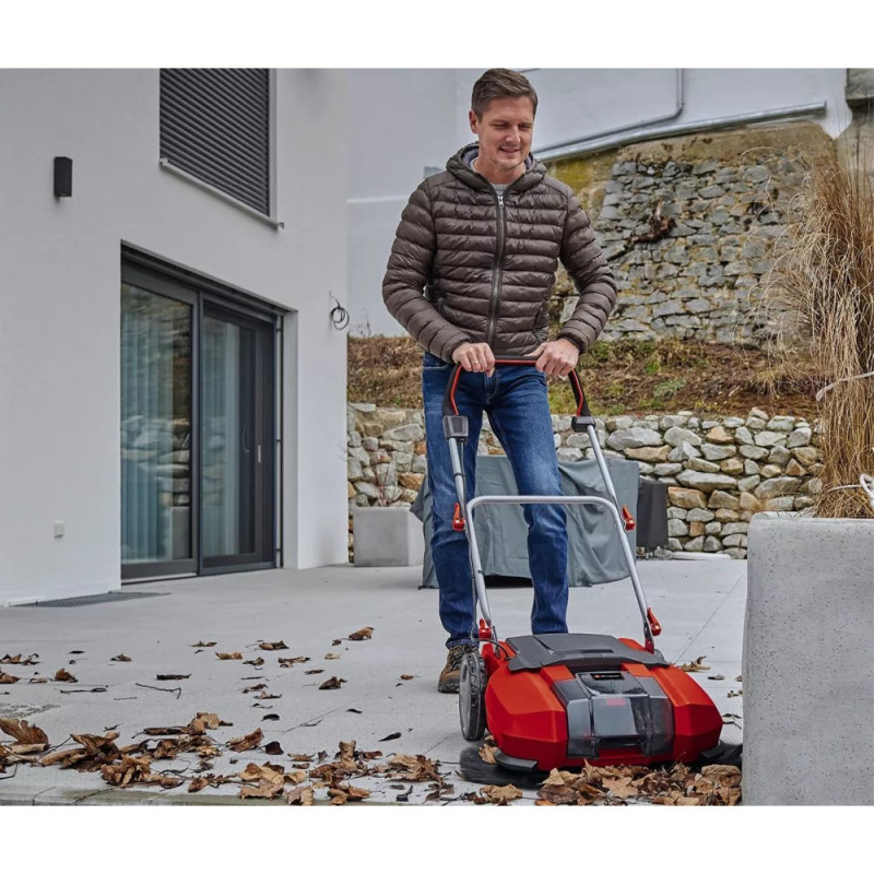 Акумуляторна підмітальна машина Einhell TE-SW 18/610 Li - Solo належить до сімейства Power X-Change та працює від одного акумулятора 18 В (не входить у комплект). Ширина підмітання 610 мм забезпечує продуктивність до 1800 м²/год, а бокові щітки дозволяють очищати краї та важкодоступні місця. Модель оснащена знімною губою для роботи на нерівних ділянках, баком для сміття об’ємом 20 л, зручним перемикачем на ручці, великими колесами та поворотними роликами для легкої маневреності.