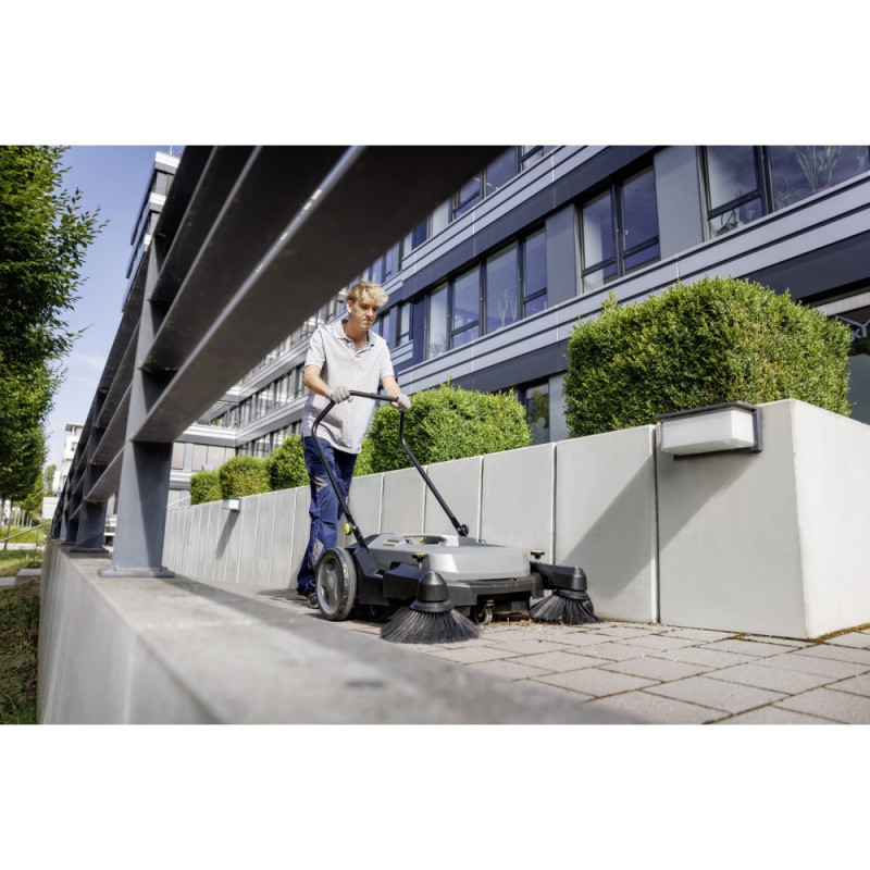 Підмітальна машина штовхаючого типу KM 70/20 C 2SB оснащена роликовою щіткою та 2 бічними щітками. Машина приводиться в дію оператором, який штовхає її. Вона легко та ефективно очищає підлоги в будівлях або зовнішні території, забезпечуючи при цьому 9-кратне підвищення продуктивності прибирання в порівнянні з підмітанням мітлою.