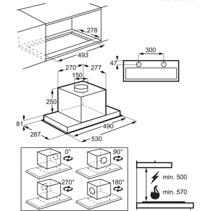Витяжка Electrolux CFG526R має вбудований тип встановлення та ширину 54 см. Функція Hob2Hood з’єднує витяжку з варильною поверхнею без проводів. Під час приготування витяжка автоматично змінює швидкість вентилятора відповідно до потужності на поверхні. Максимальна продуктивність становить 600 м³/год. Модель виконана в чорному кольорі та оснащена LED-освітленням.